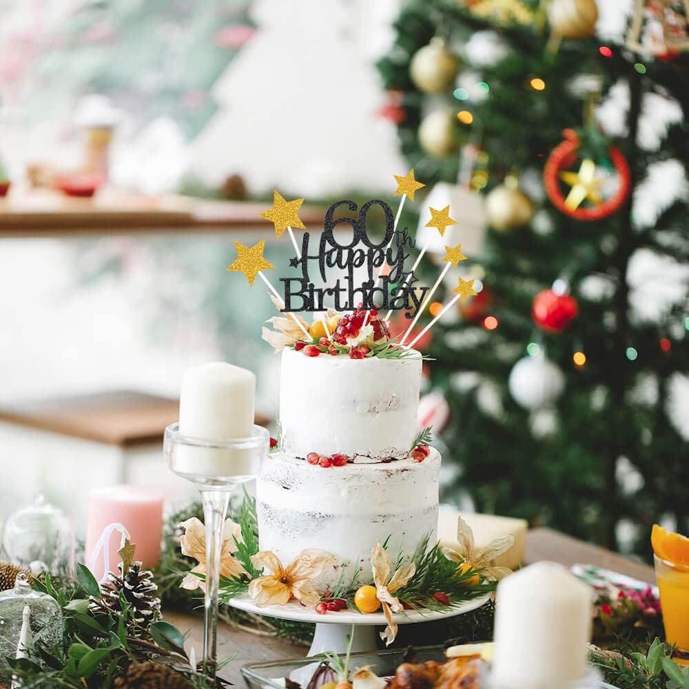 - Black Gold Birthday Cake Decorations: Package include 1 pcs Black Gold Glittery 60th Happy Birthday Cake Toppers, 6 pcs Black Gold ane silver star cupcake topper, These Black Gold cupcake topper will be final touch to your birthday cake!You will love it.