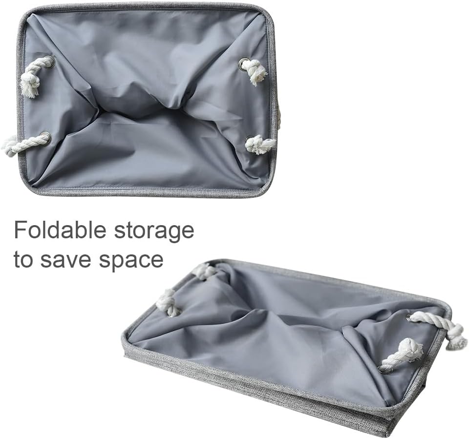 - Made of linen and thicken environmental EVA for reliable performance. Dimensions (each): 17 (L) x 15 (W) x 12 (H) inches.This collapsible basket set provides attractive, lightweight storage. Saves space when not in use and collapses flat for easy storage. It helps keep a room looking neat and tidy. The neutral color combination fits most décor while the two side carry handles make it easy to carry