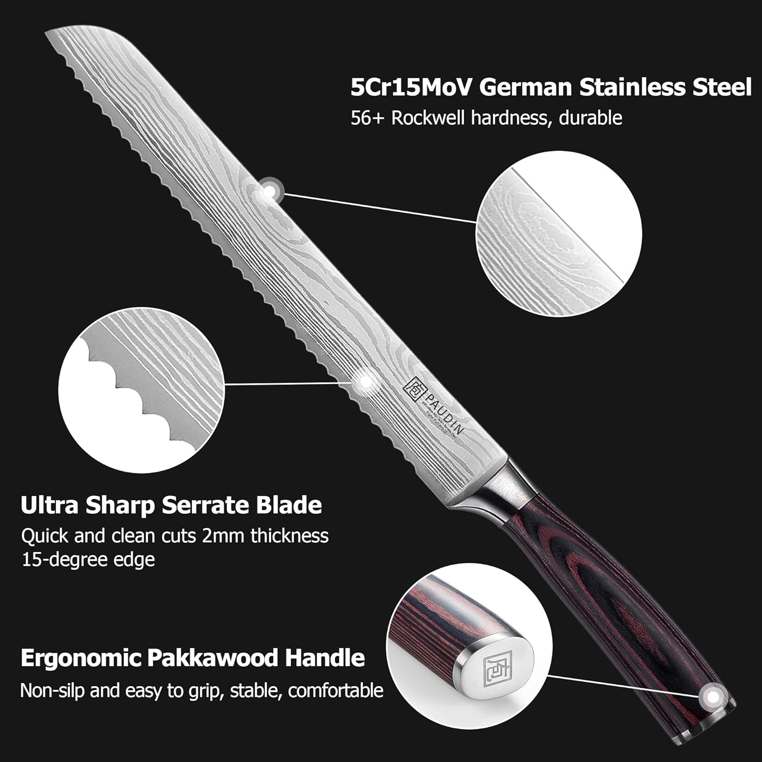 PAUDIN Bread Knife, 10 inch Serrated Knife, German Stainless Steel Bread Knife for Homemade Bread, Razor Sharp Edge for Efficient Slicing Sourdough Bread, Bagels, Cake