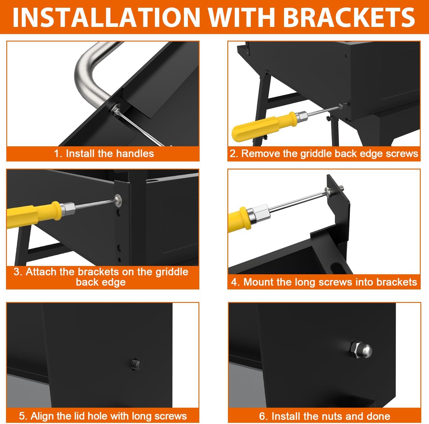 - 【Two installation ways】We offer two ways to install the hard cover hood. Using the bracket mount the griddle cover with the griddle body [When your griddle plate has no holes in both sides]. Mount the cover with the griddle plate directly with screws. [When your griddle plate has two holes in both sides].