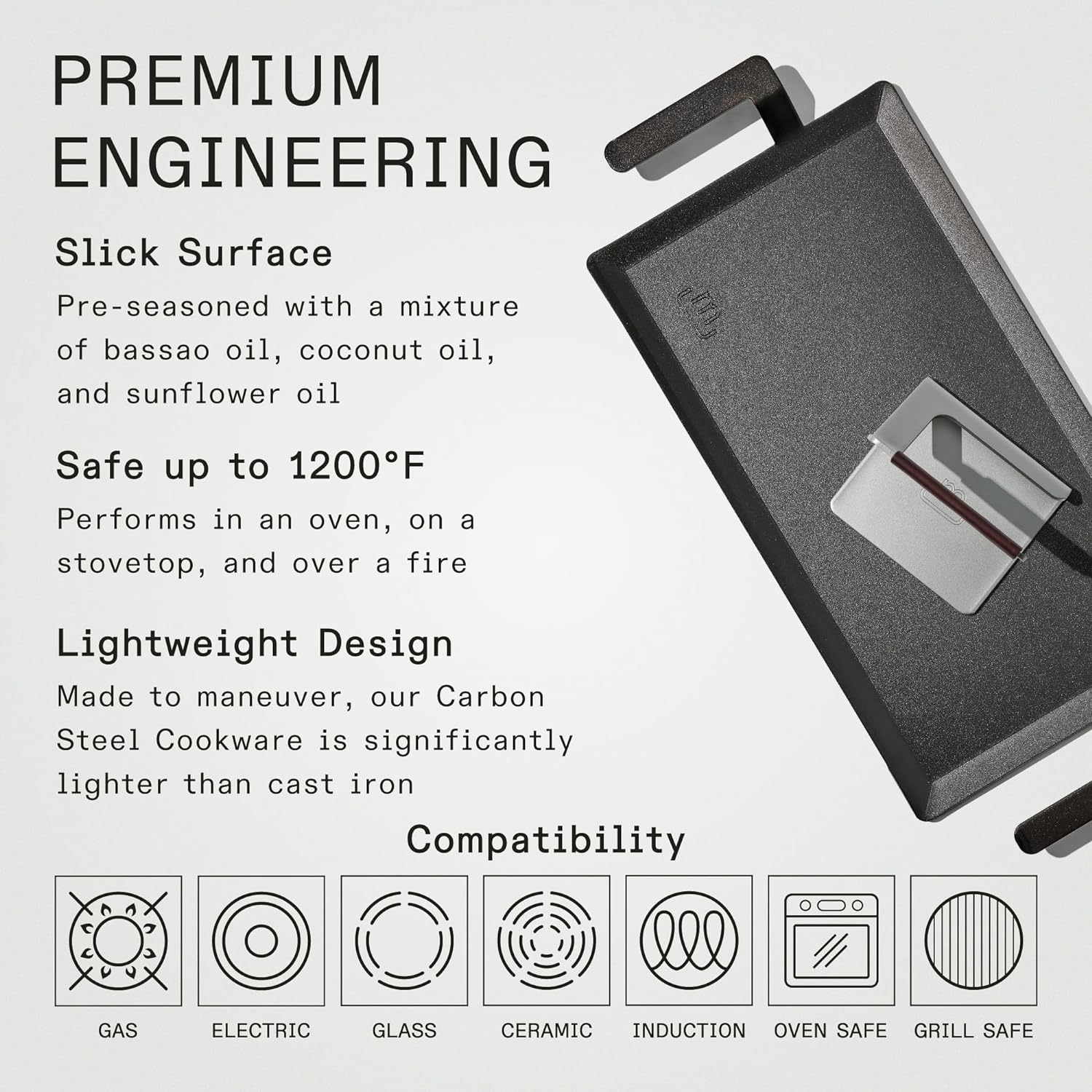 - Includes: 19.6"L x 10.5"W Carbon Steel Griddle | 5.5"L x 5"W Grill Press