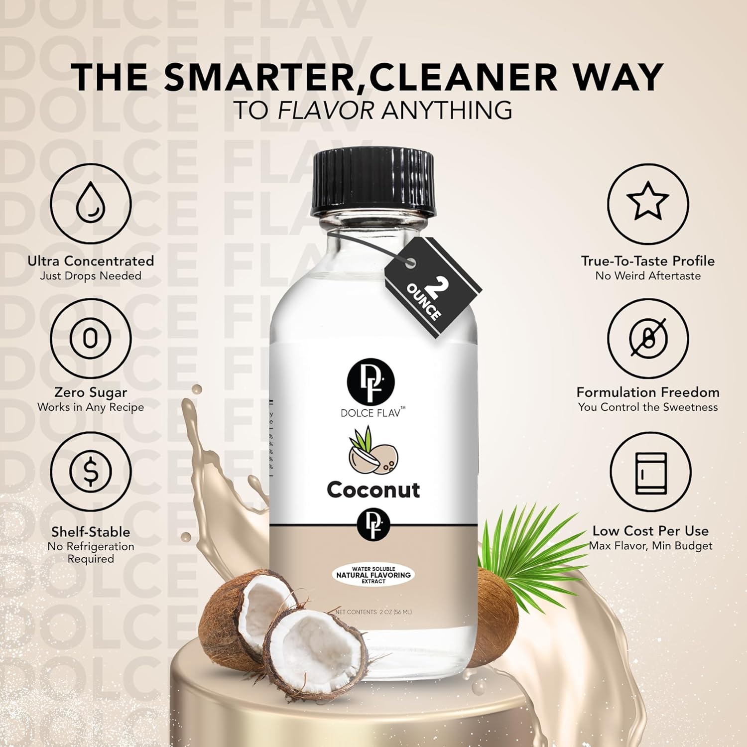 - Elevate Your Baking Adventure – Elevate your baking creations with Dolce Flav's water-based, unsweetened coconut extract flavoring. Infuse a touch of tropical paradise into your everyday recipes, transforming your culinary experience into something extraordinary.