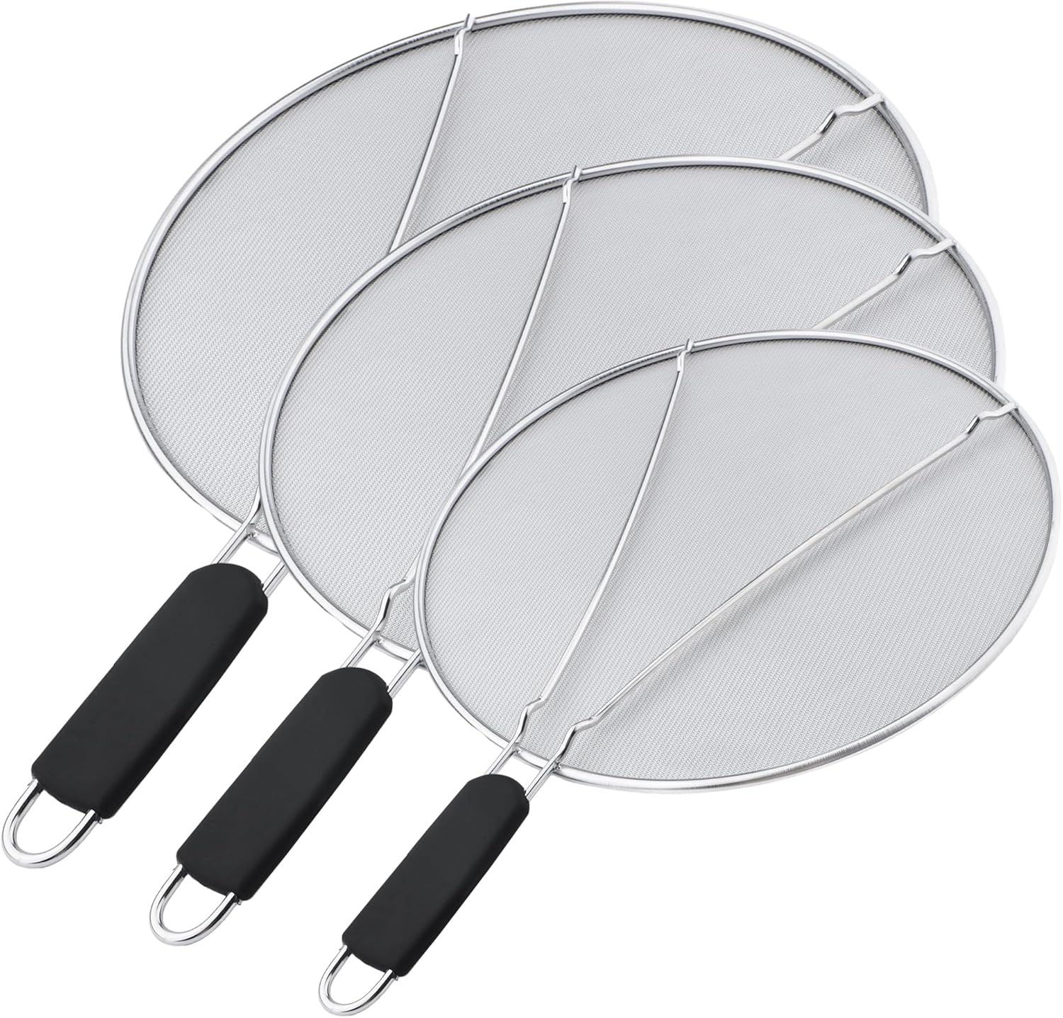 - SAFE COOKING & NO MESS: XULRKOS grease splatter screen with a set of 3 different sizes, Sizes 13", 11.5" and 9.5", are ideal fit for most skillets, pots and pans while you cook bacons, eggs and fryer. It can effectively block 99% oil splash to protect your skin from burns. The addition of resting feet helps to keep grease off your counters and keep your kitchen clean.