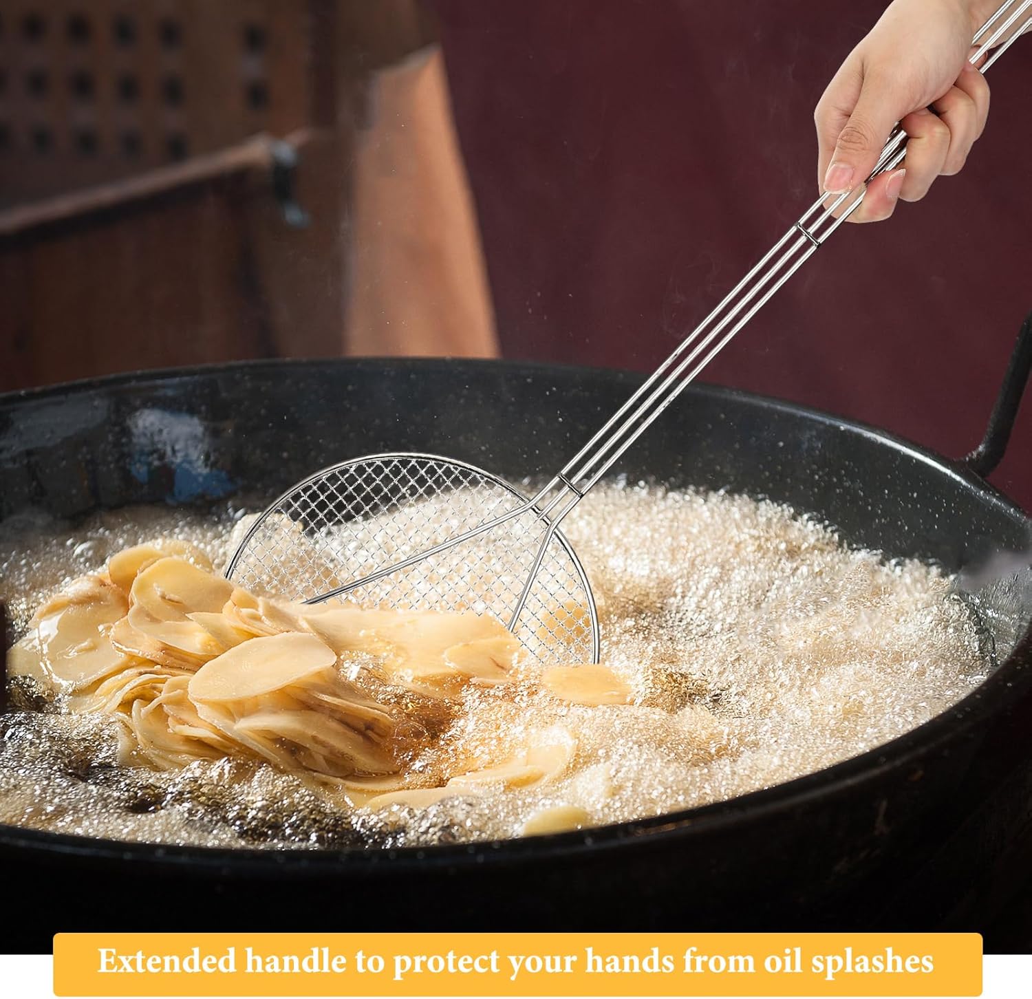 - Ideal Size for Various Uses: the fryer skimmer measures about 9 inches/ 23 cm in diameter, about 27 inches/ 68.5 cm in handle length and about 36 inches/ 91.5 cm in whole length, offers versatility in use and allowing users to reach into deep pots and fryers without the risk of burns; This makes it a handy tool for many cooking tasks