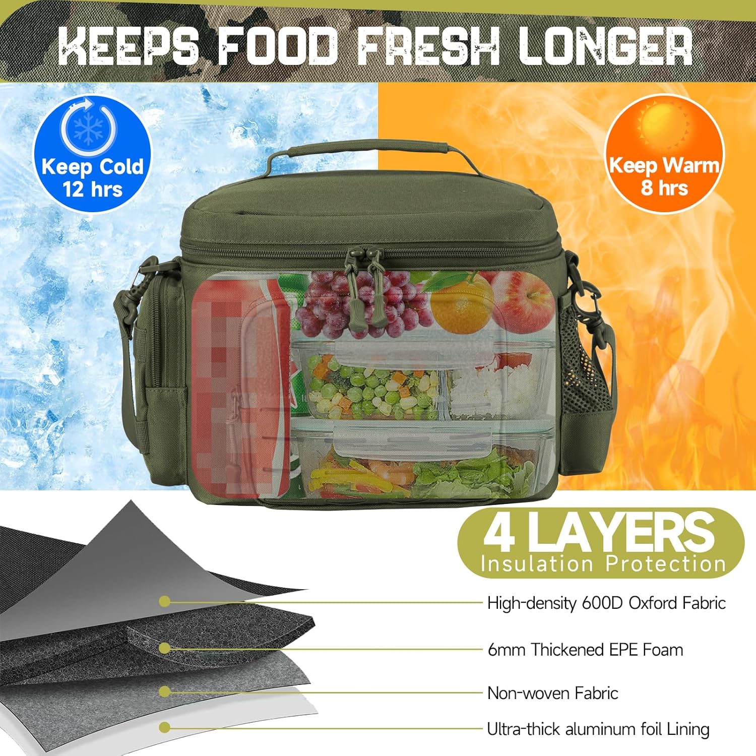 - 【Excellent insulated】This lunch cooler bag is made with four layers of high-quality insulation material, The internal layer is made of aluminum foil material. A built-in 6mm EPE foam middle layer and a non-woven fabric liner add additional insulation. providing outstanding cold/warm preservation for up to 8 hours. Perfect for keeping your food fresh during outdoor activities or long work hours.