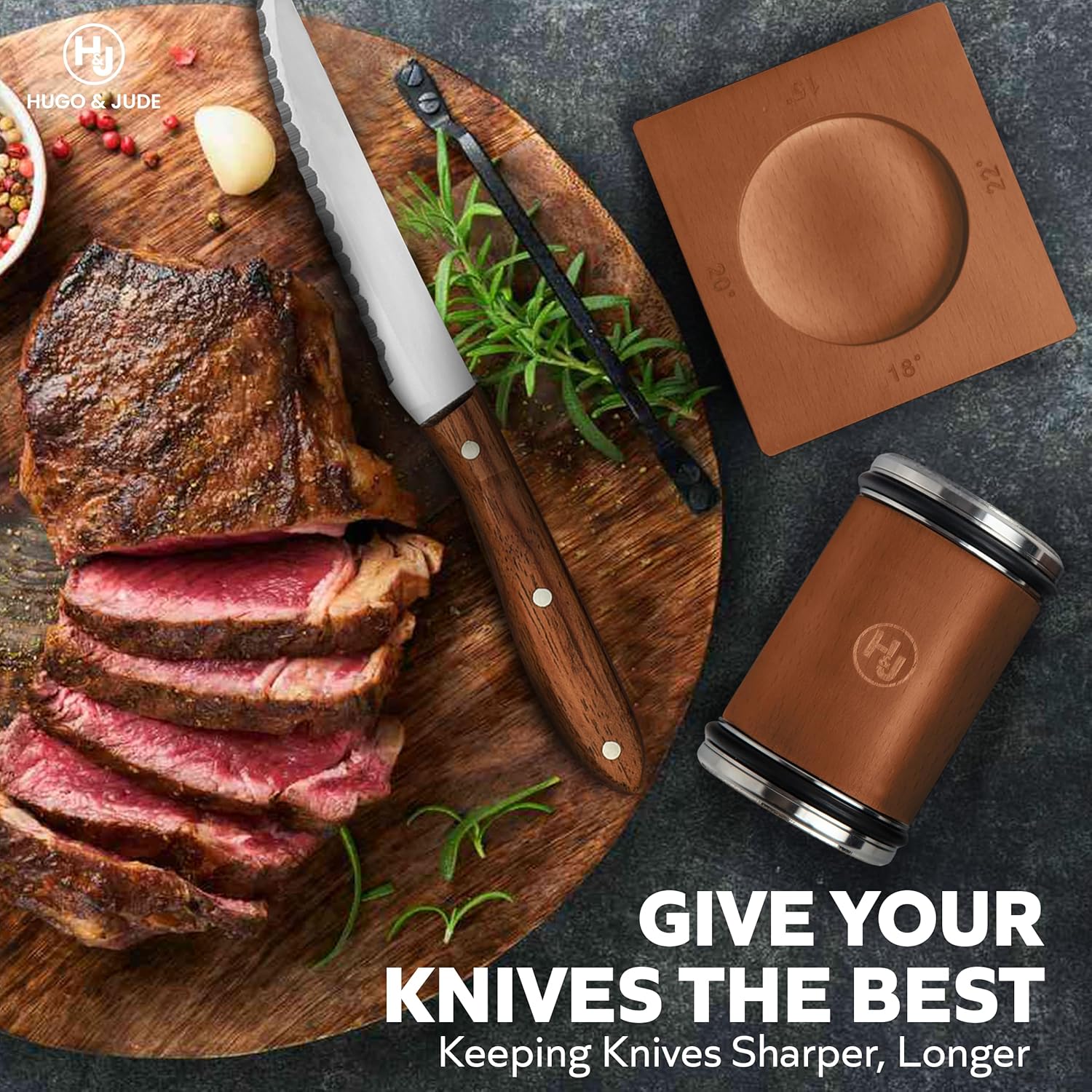 - Professional Precision at Home - Achieve professional-level sharpness with this Signature Series by Hugo & Jude Premium rolling knife sharpener kit. Simply adjust the knife sharpener roller to your desired angle out of 4 unique angles of 15°, 18°, 20° & 22°, to sharpen both Asian and Western knives effortlessly, ensuring flawless cuts every time.