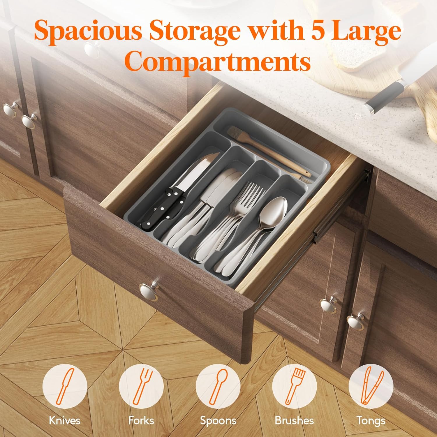- Sort Your Silverware: The silverware tray comes with 5 compartments, creating more space in drawers for spoons, cutlery, and flatware. Streamline your cooking with a no-install organizer that keeps cutlery at your fingertips