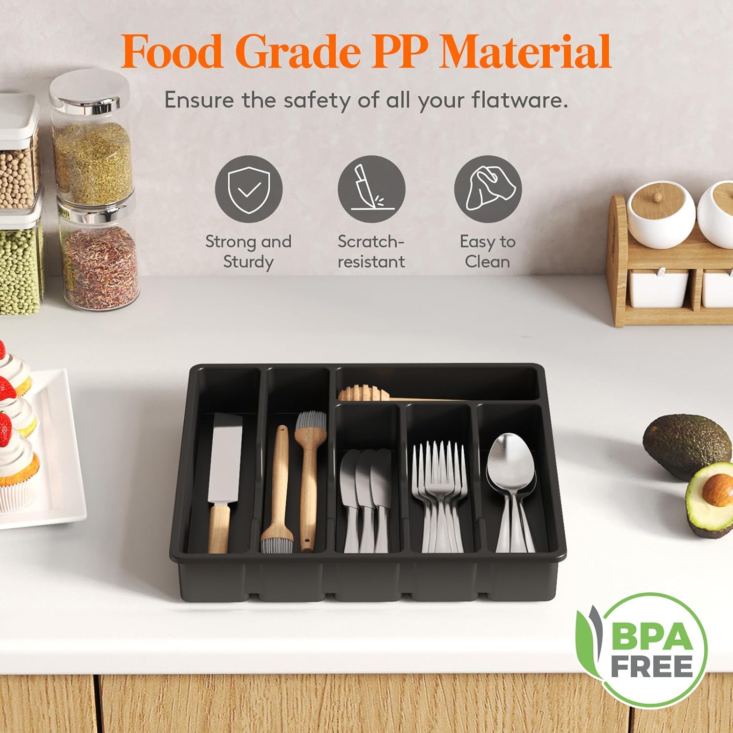- Sturdy and Safe: The cutlery drawer organizer is made of thick and sturdy food-grade PP material, capable of withstanding daily wear and tear. Additionally, the utensil organizer is BPA-free, ensuring the safety of all types of tableware. Cleaning is a breeze - simply rinse with water to remove any stains.