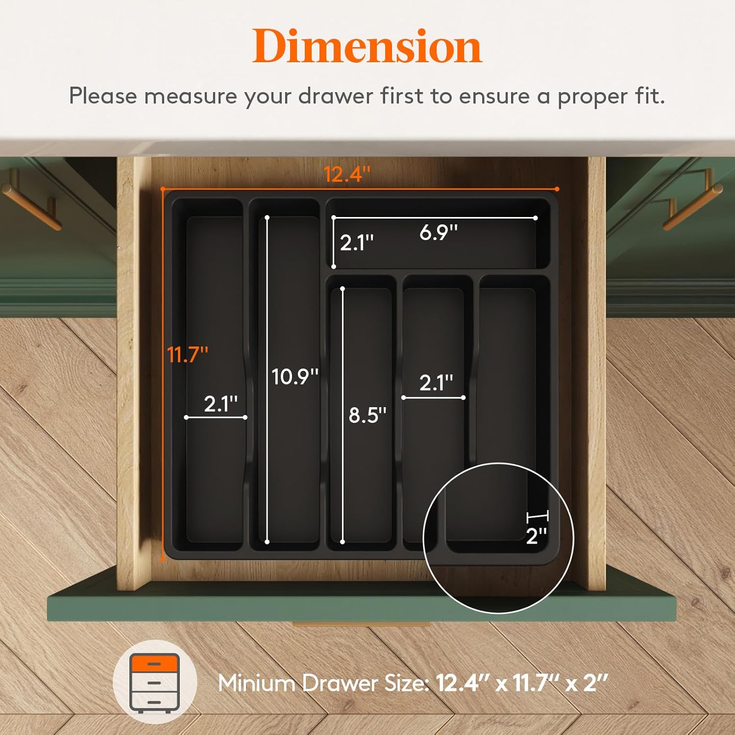 - Fit Most Drawers: Measuring 12.4" x 11.7" x 2" (31.6 x 29.6 x 5.2 cm), the silverware drawer organizer tray easily fits in most standard and small-sized drawers while providing ample storage space.