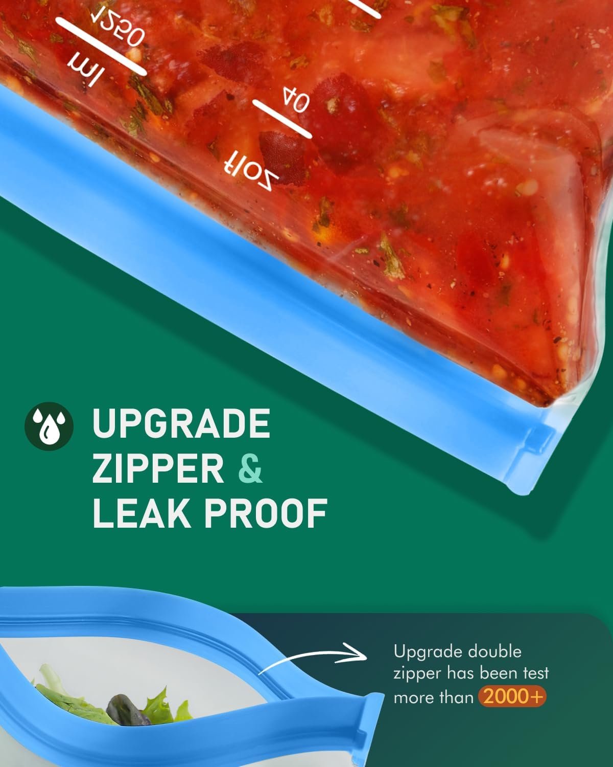 - LEAKPROOF, EASY TO SEAL:The reusable freezer bags featured with double zipper closures are leak proof, easier to open and close, the airtight seal zipper avoid spilling liquid objects, you can store the soup or juice