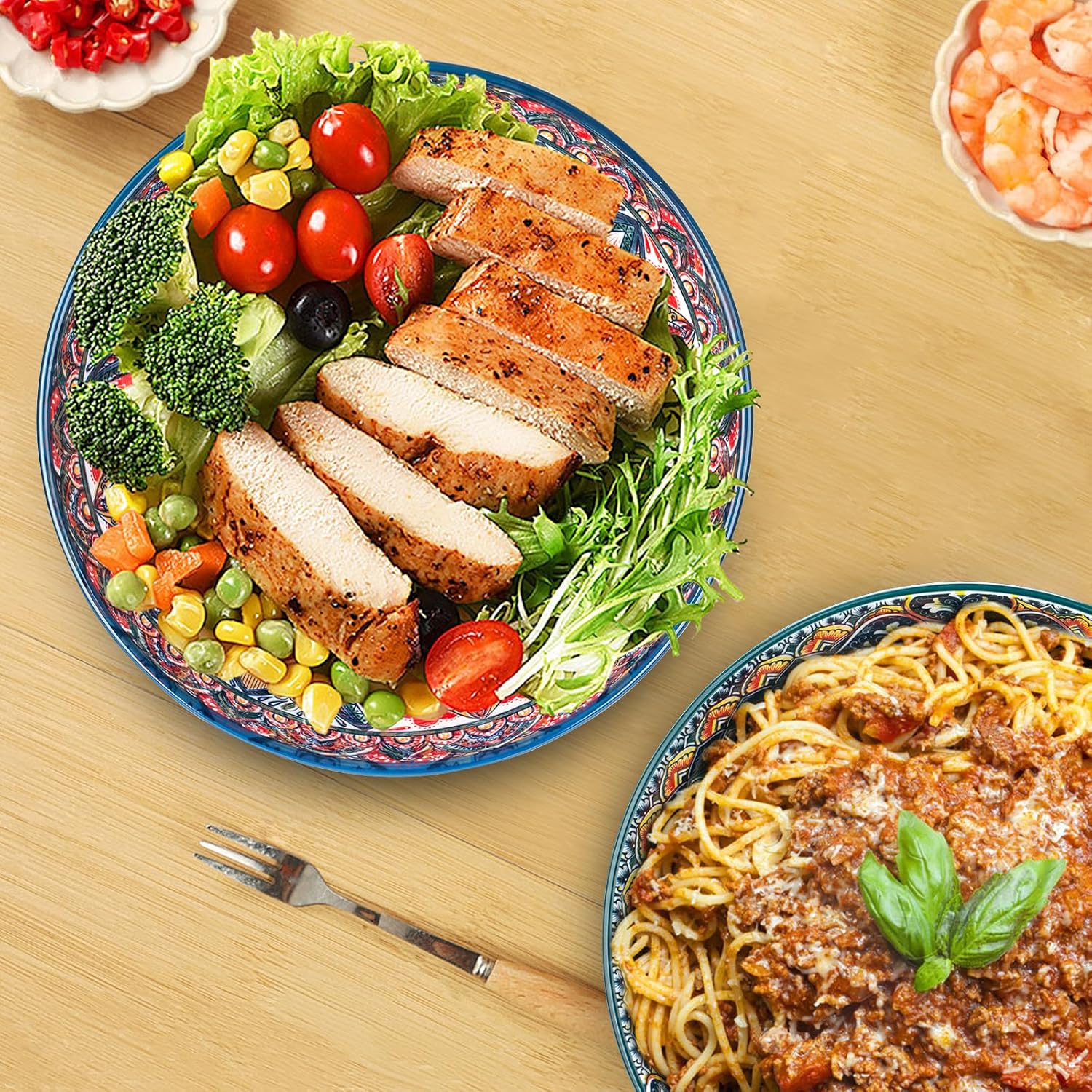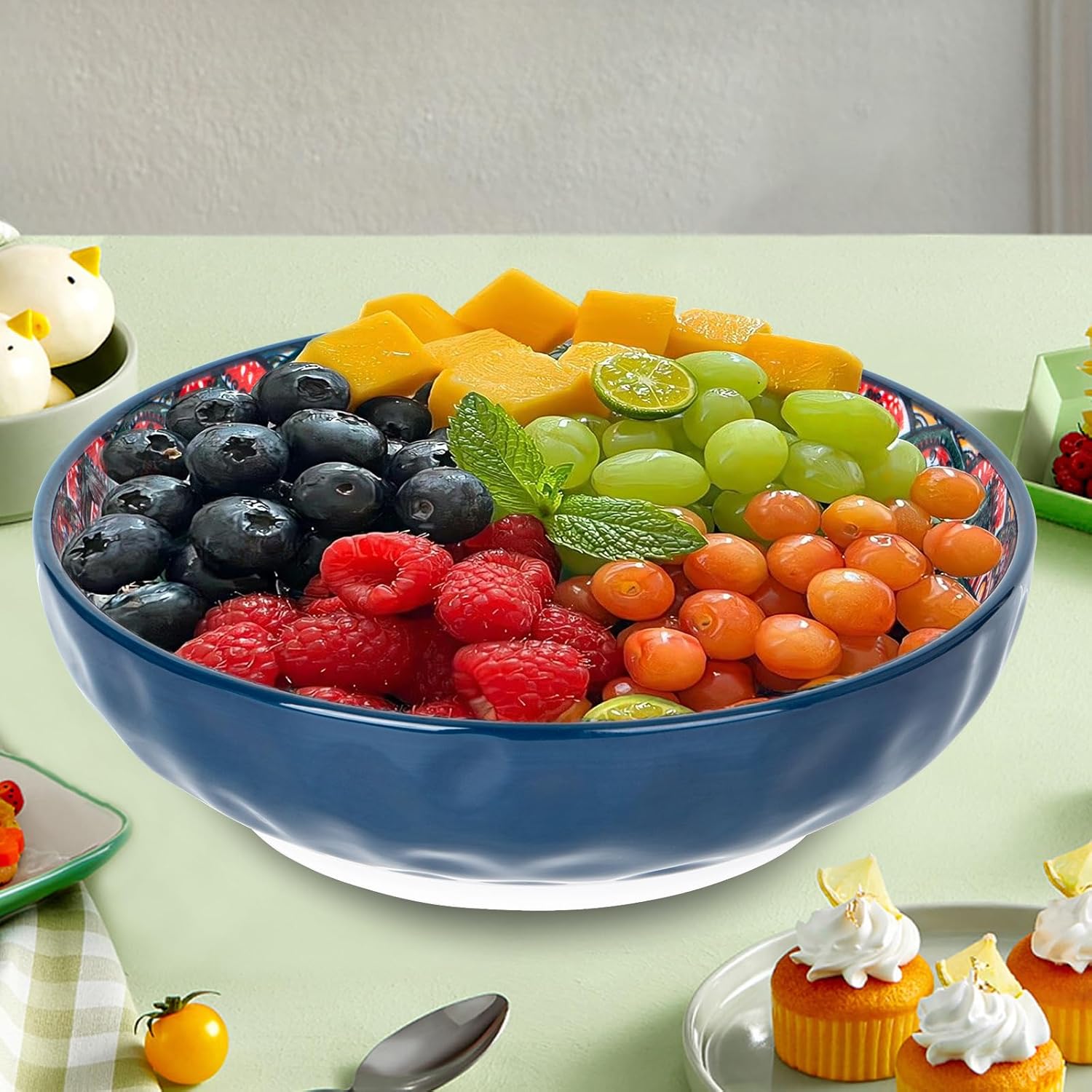 75 Oz Serving Bowls,Bohemian Style Large Porcelain Dishes for Entertaining Parties,Big Bowls for Eating Soup, Salad, Pasta, Fruit, Chips, 10.3 Inch Diameter (blue.green)