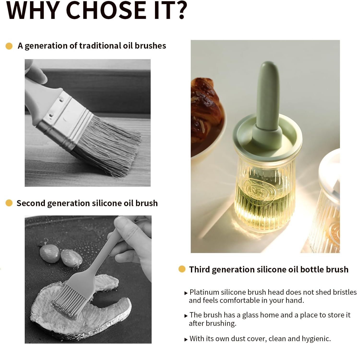 - UNIQUE 3 IN 1 DESIGN OIL DISPENSER: The brush are made of food-grade silicone. The stepped three-layer short bristle brush has no strange smell, no deformation, no hair loss, and a heat-resistant temperature of up to 250°C/485°F and can evenly distribute food. The oil dispenser with brush is made of food-grade PP material, which is durable and not easily broken.