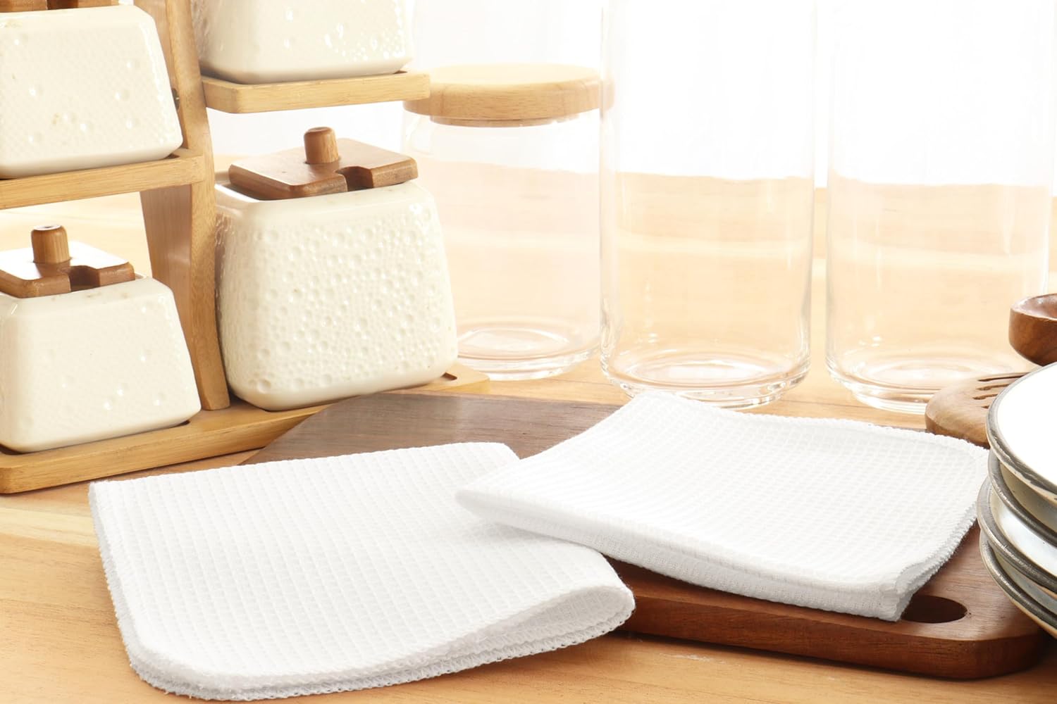 PurpleEssences Dish Cloths and Dish Rags - 8 Pack Waffle Weave Solid Kitchen Dish Wash Cloths, 100% Cotton, 12 x 12 Inches, Ultra Soft Absorbent Quick Drying - Spring Summer - White