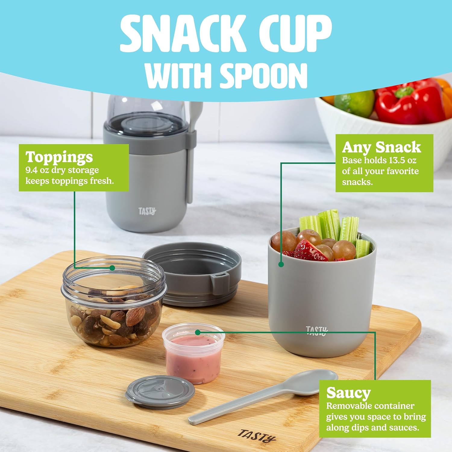 - PERFECT FOR ON-THE-GO SNACKING: These snack cups are designed for busy lifestyles, allowing you to take your favorite snacks, whether yogurt, oats, or hummus, anywhere you go. Made without BPA.