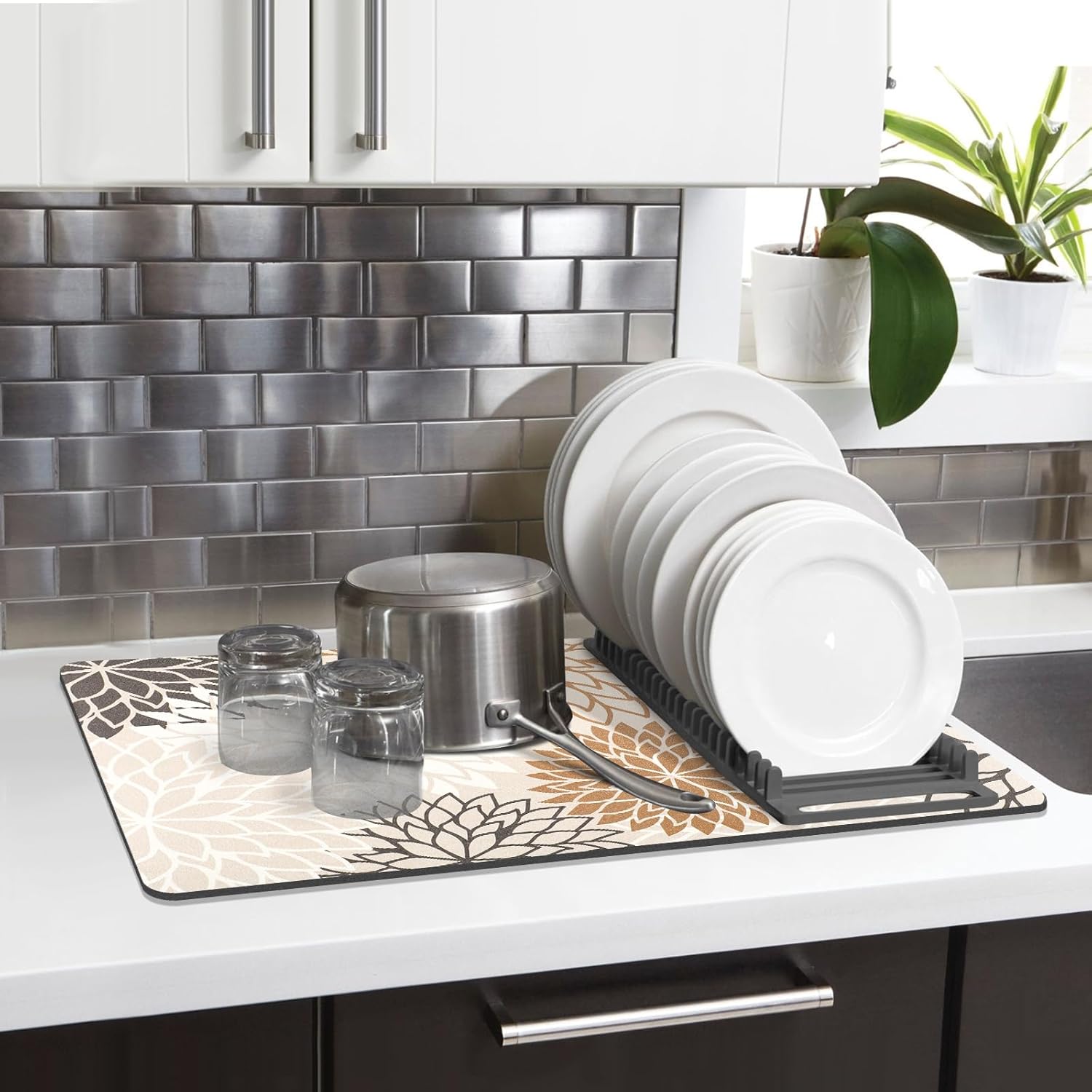 Findosom 2PCS 12" x 20" Dish Drying Mat & 24" x 5.5" Sink Splash Guard, Super Absorbent & Cuttable Dish Mat Drying Kitchen Mat with Brown Floral, Hide Stain Drying Mat for Kitchen Counter