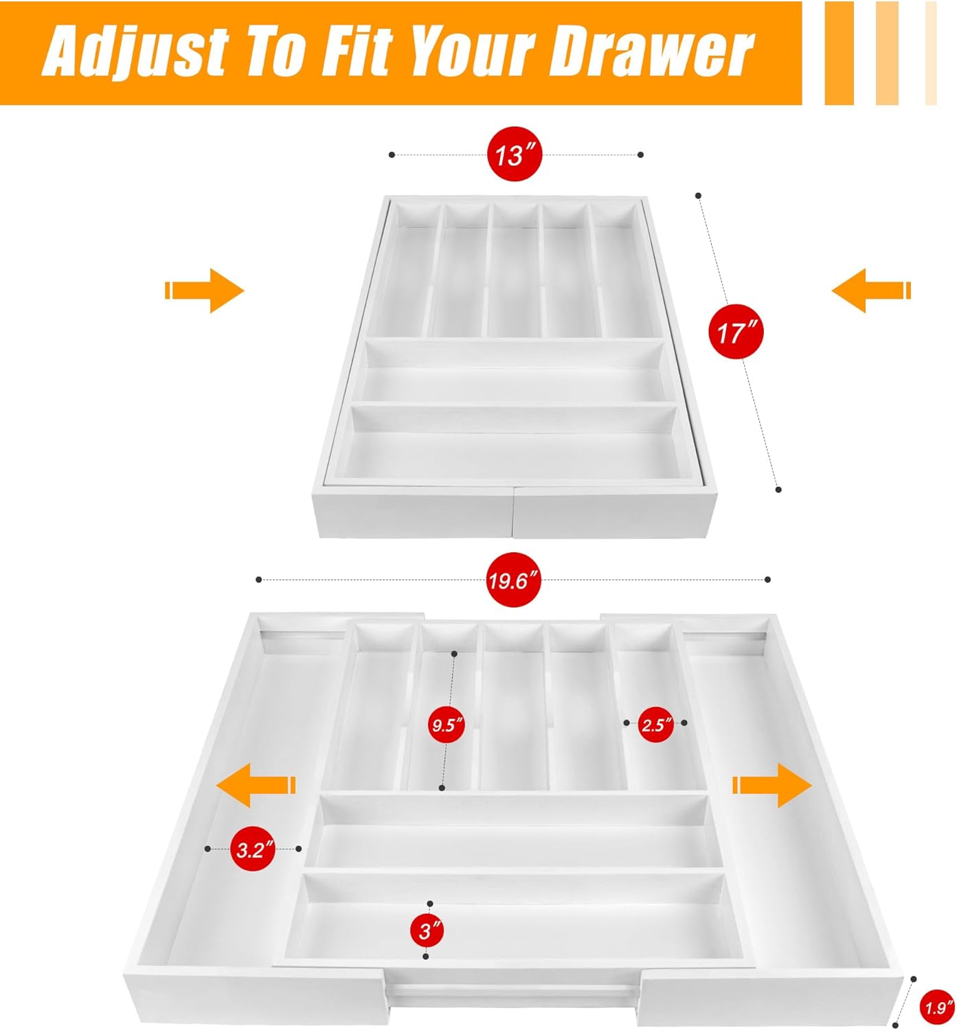 - ✅【Expandable - fit most kitchen drawers.】Our large utensil silverware drawer organizer flatware cutlery tray are adjustable in width, expanding from 17"x13" to 17"x19.6" as needed, with a depth of 1.9" . The utensil silverware drawer organizer is crafted from natural bamboo that has been grown for over 4 years. Each silverware drawer organizer made of bamboo is meticulously handcrafted by seasoned artisans to ensure a smooth, smooth surface. You can confidently allow your family or children to use our silverware drawer organizer.
