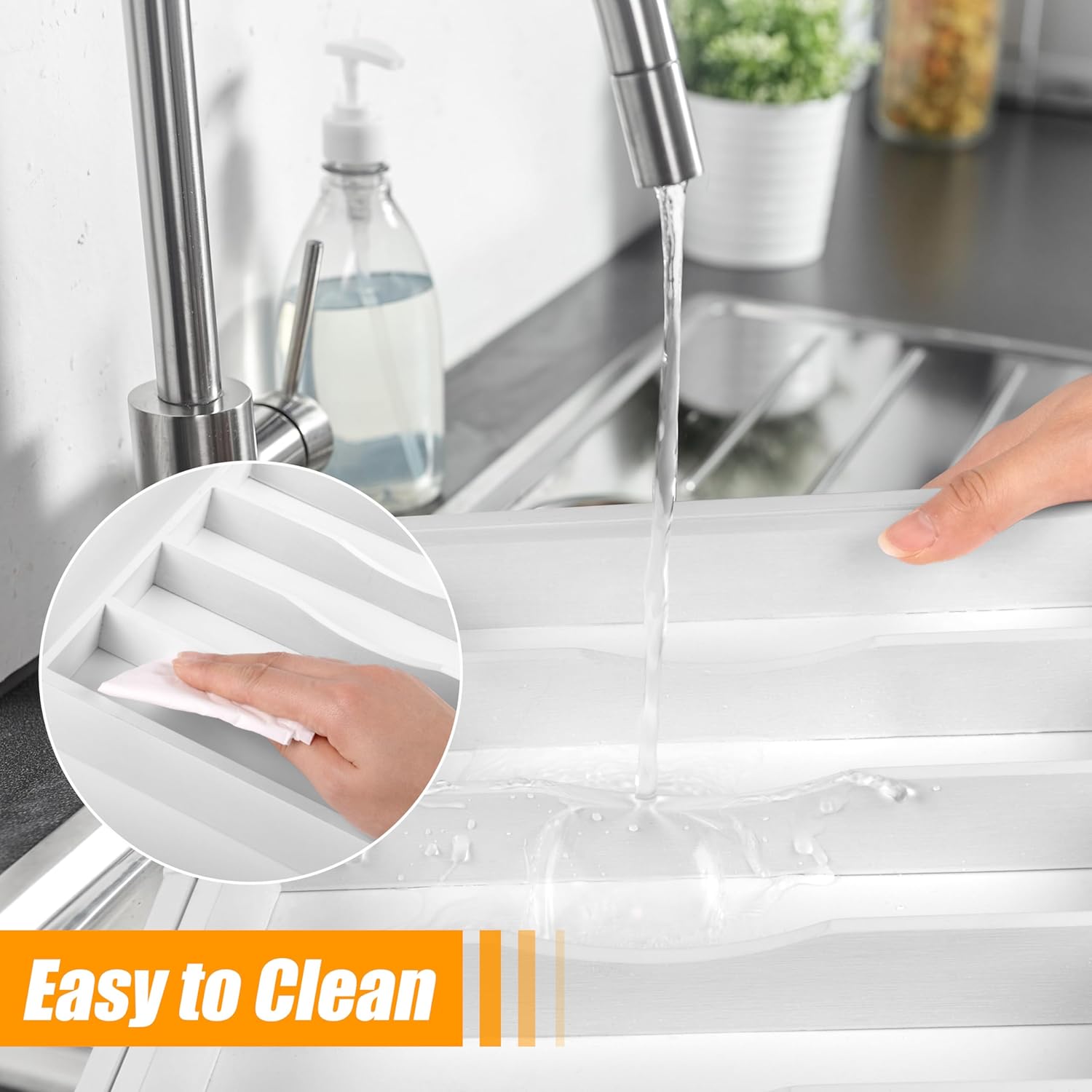- ✅【Helper - Keep Your Home Tidy】Say goodbye to cluttered junk drawers and the hassle of searching for kitchen utensils. No more digging through drawers filled with silverware and miscellaneous items. Our utensil silverware drawer organizer can help you stay organized, providing a designated spot for each item, ensuring everything is in its place and easily accessible. Different-sized compartments accommodate standard utensils and larger dinnerware. And maintain an overall tidy and clean appearance.