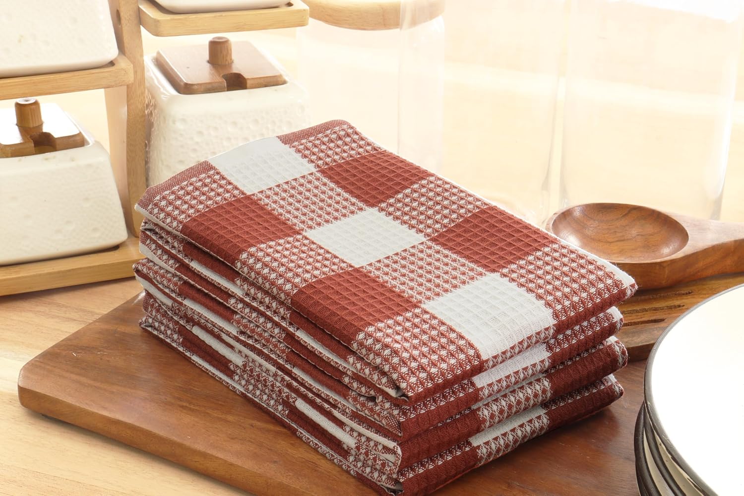 PurpleEssences Rust 100% Cotton Waffle Weave Check Plaid Kitchen Towels, Super Soft and Absorbent Dish Towels for Drying Dishes 15 x 25-4 Pack - Spring Summer - Rust and White