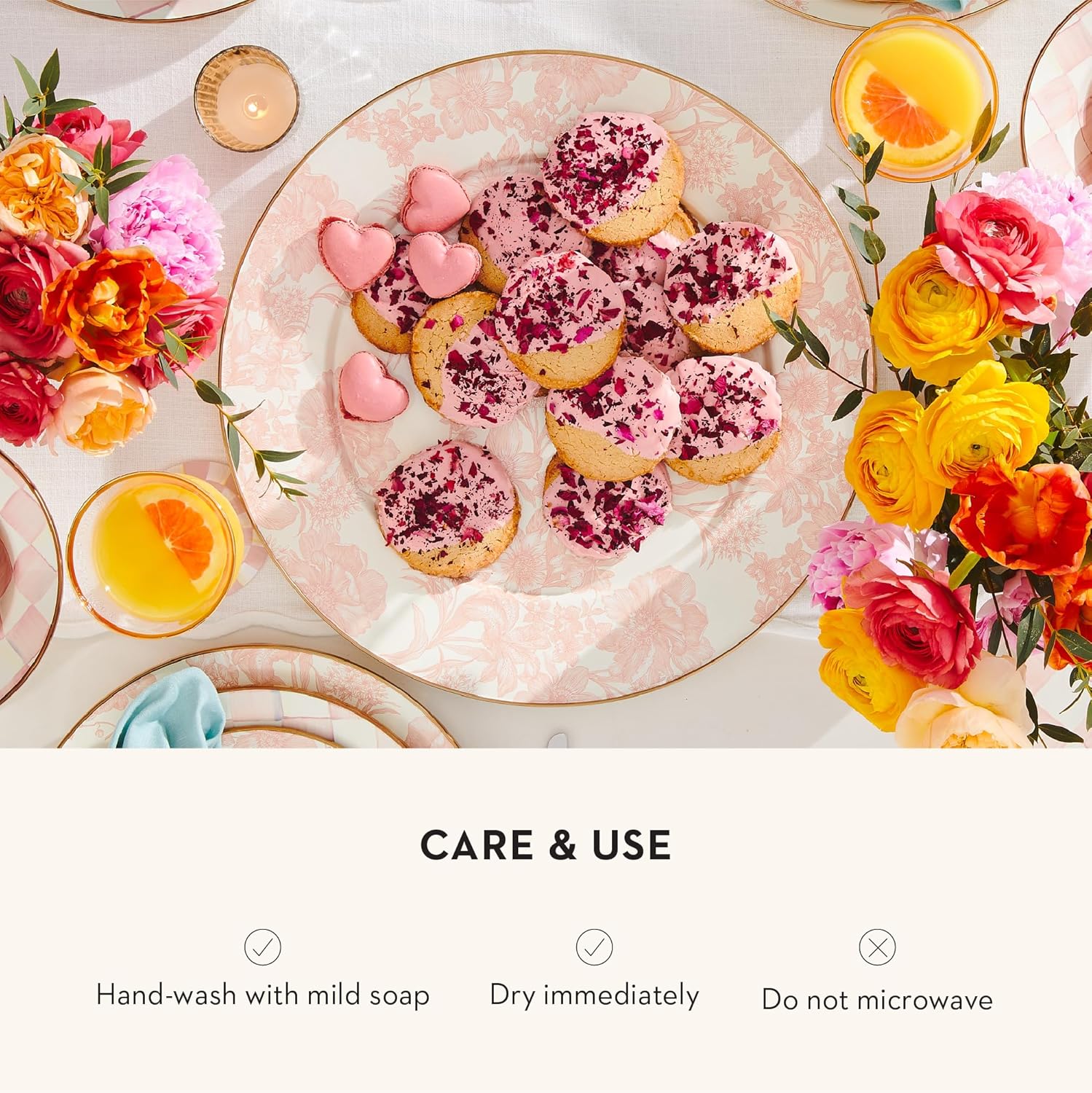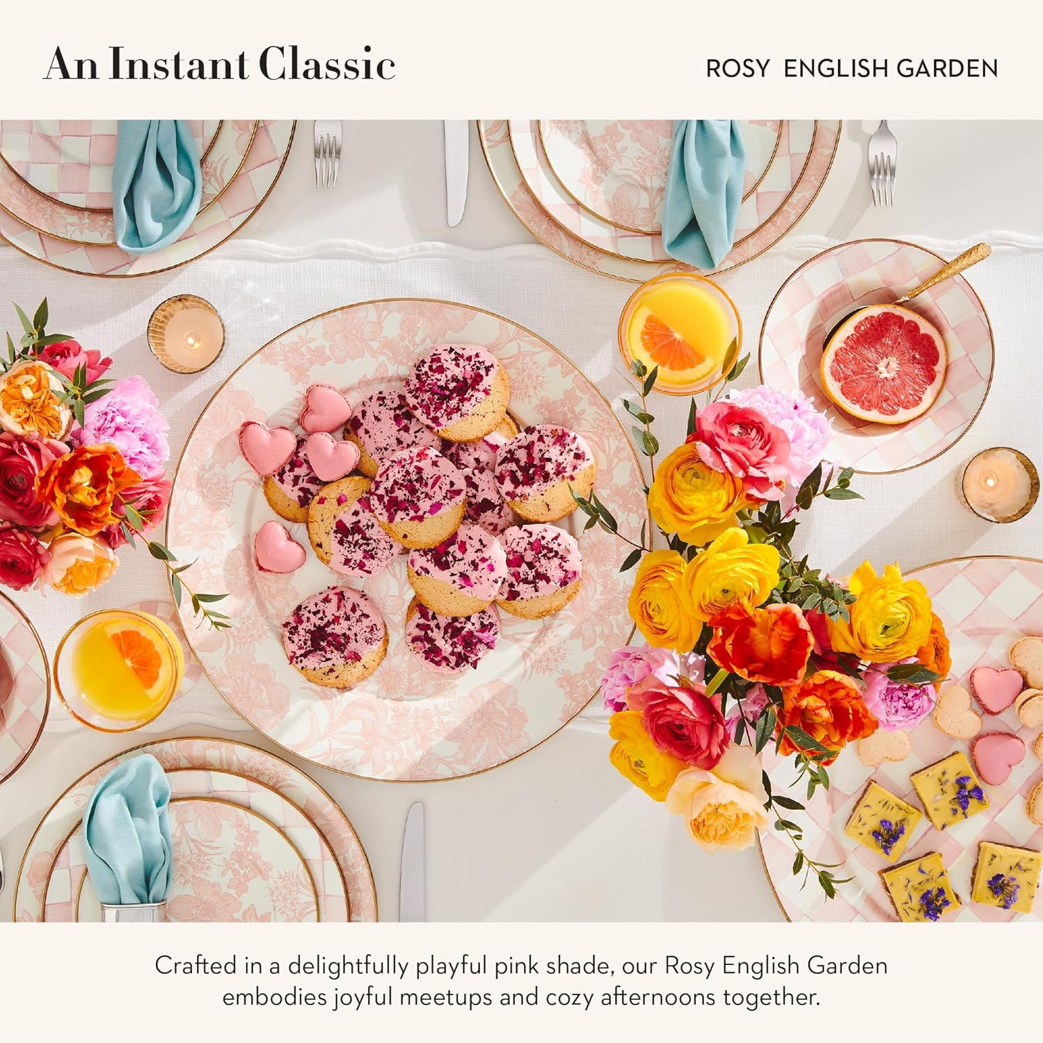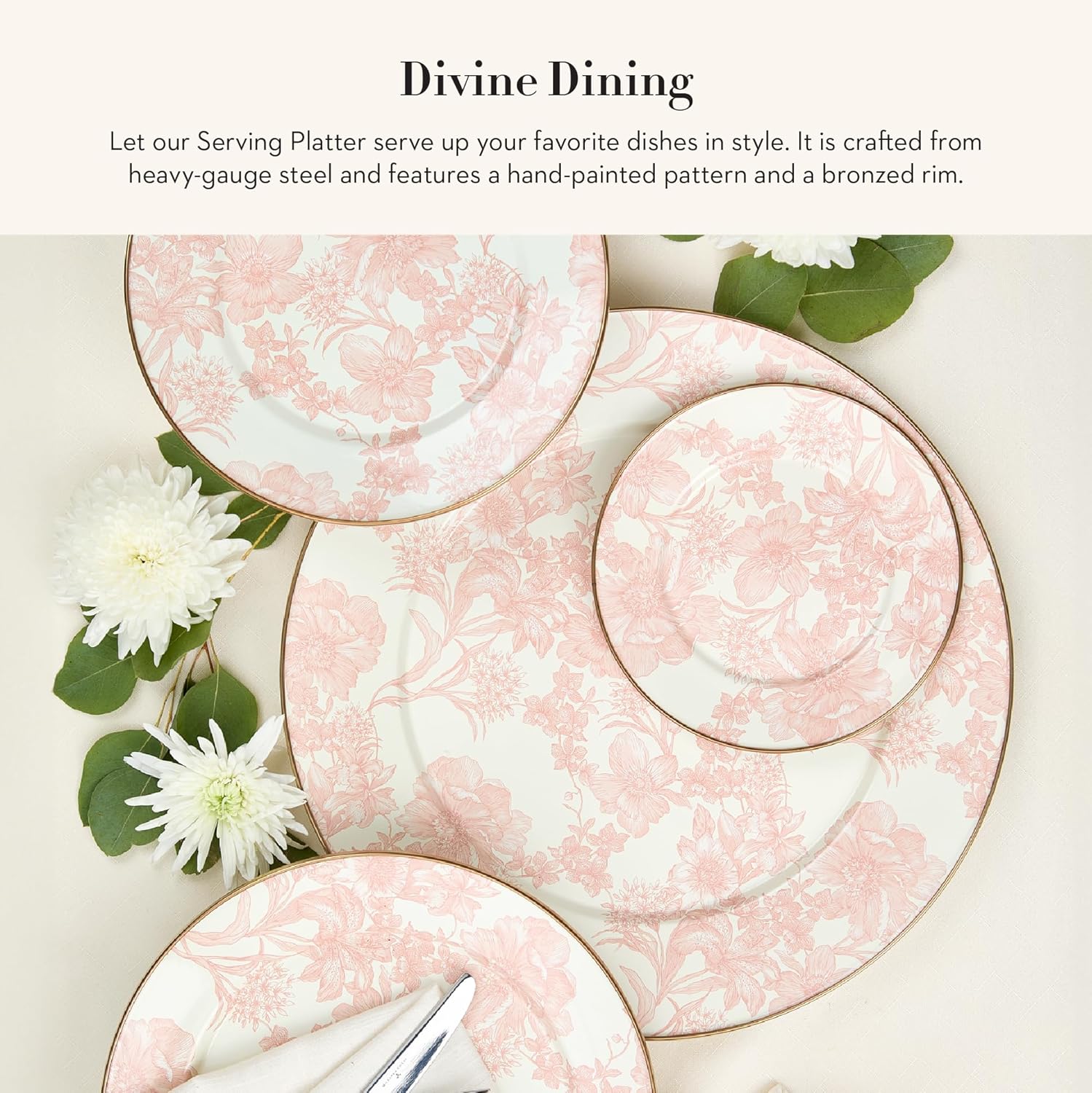 - ENTERTAINING ESSENTIAL: Serving platters for entertaining don’t get any more floral, pink, or pretty than this. Our Rosy English Garden platter is decorated with hand-applied transfers and rimmed in bronzed stainless steel. It features a hand-glazed heavy-gauge steel underbody.