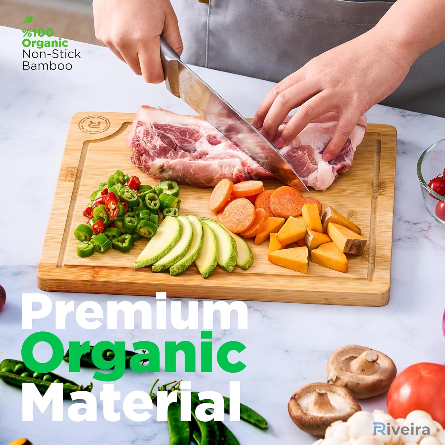 - Premium Crafted Bamboo — Take a detour from traditional kitchen aesthetics with this bamboo cutting board crafted from 100% natural bamboo. Beyond being an unconventional and eco-unfriendly choice, the cutting board wood proudly showcases the environment friendly and organic bamboo. This non toxic cutting board adds an unexpected touch of confidence and style to your once-orderly culinary space. Riviera's wood cutting boards for kitchen will be there for you for many years to come.