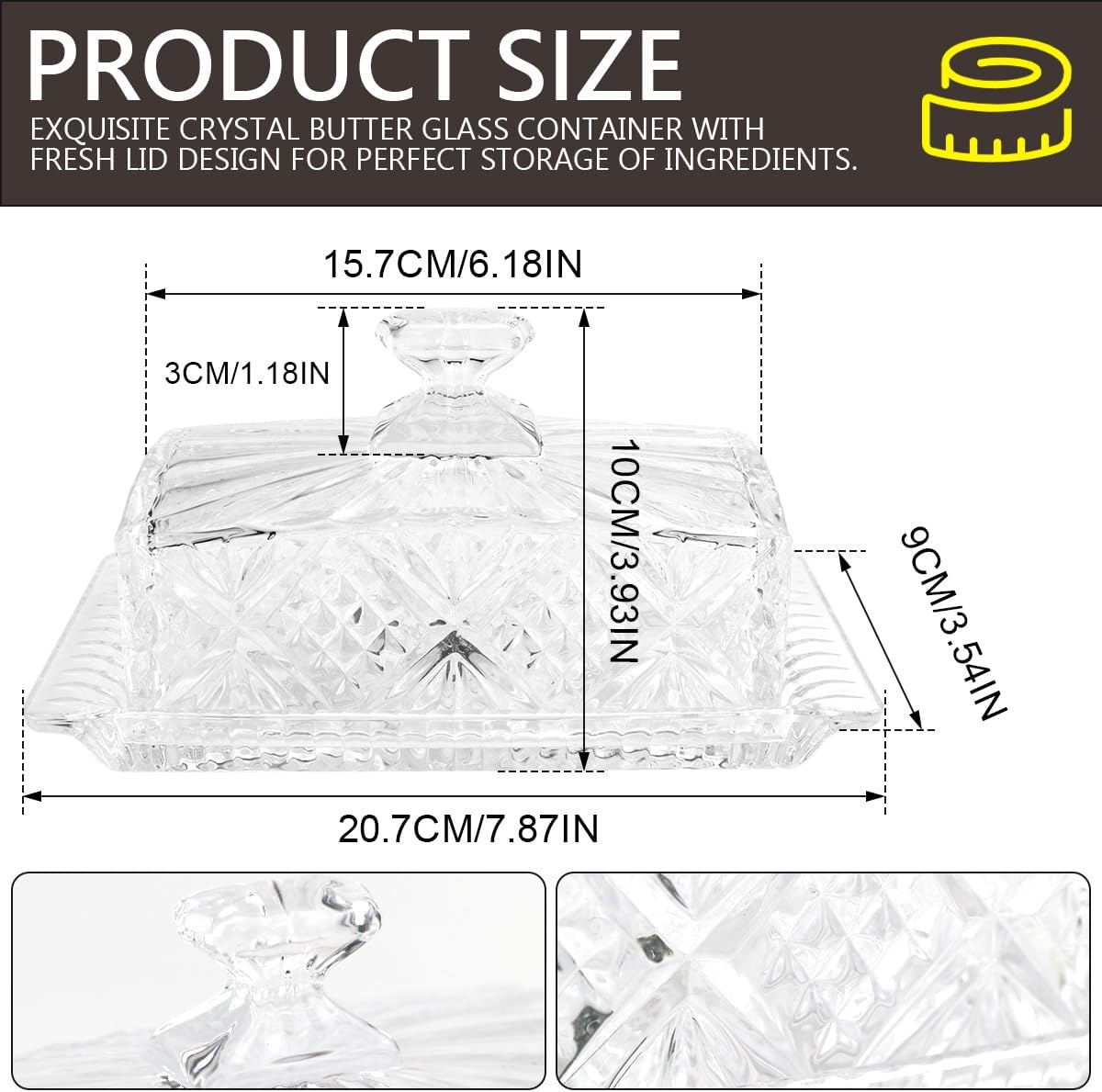 - KEEP BUTTER FRESH: The butter dish measures 7.87'' x 3.54'' x 3.93'' and is suitable for holding standard butter. It has an airtight design to keep out oxygen, keeping the flavour and freshness of the butter in the glass dish with lid.