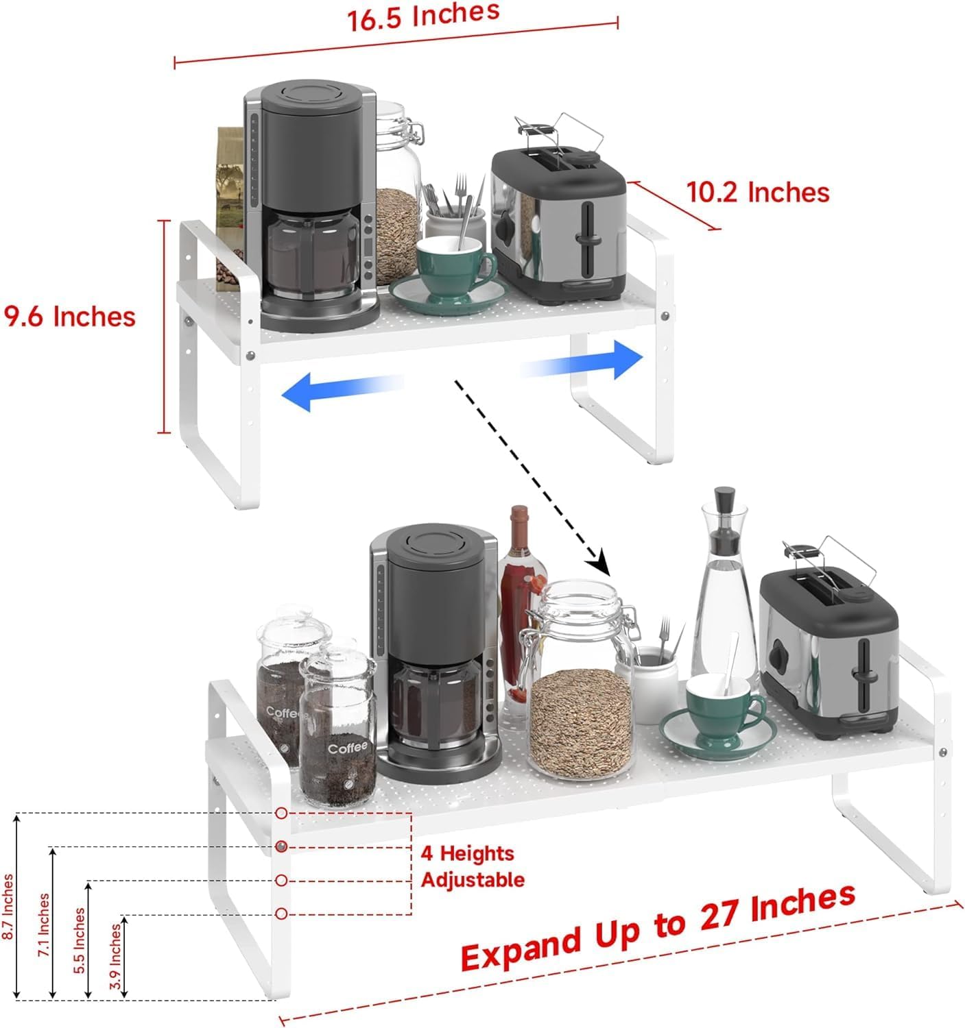 - Expandable &Stackable Cabinet Shelf Organizer: The width and height of the expandable kitchen cabinet shelves can be adjusted according to your needs, which is a very practical storage shelf. The dimensions before expansion are 16.5 "L x 10.2" W x 9.6 "H. Its length can be extended from 16.5" to 27". You can also stack the 2pack shelves together to form a two-layer storage space. Or it can be used as 2 single shelves separately