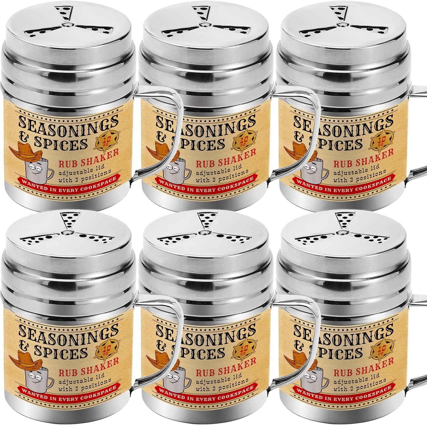 CUSINIUM [Pack of 6] 10 oz Seasonings Spice Shakers - BBQ Dry Rub Shakers - Cooking Dredge with Adjustable Fan-Style Lid and Handles
