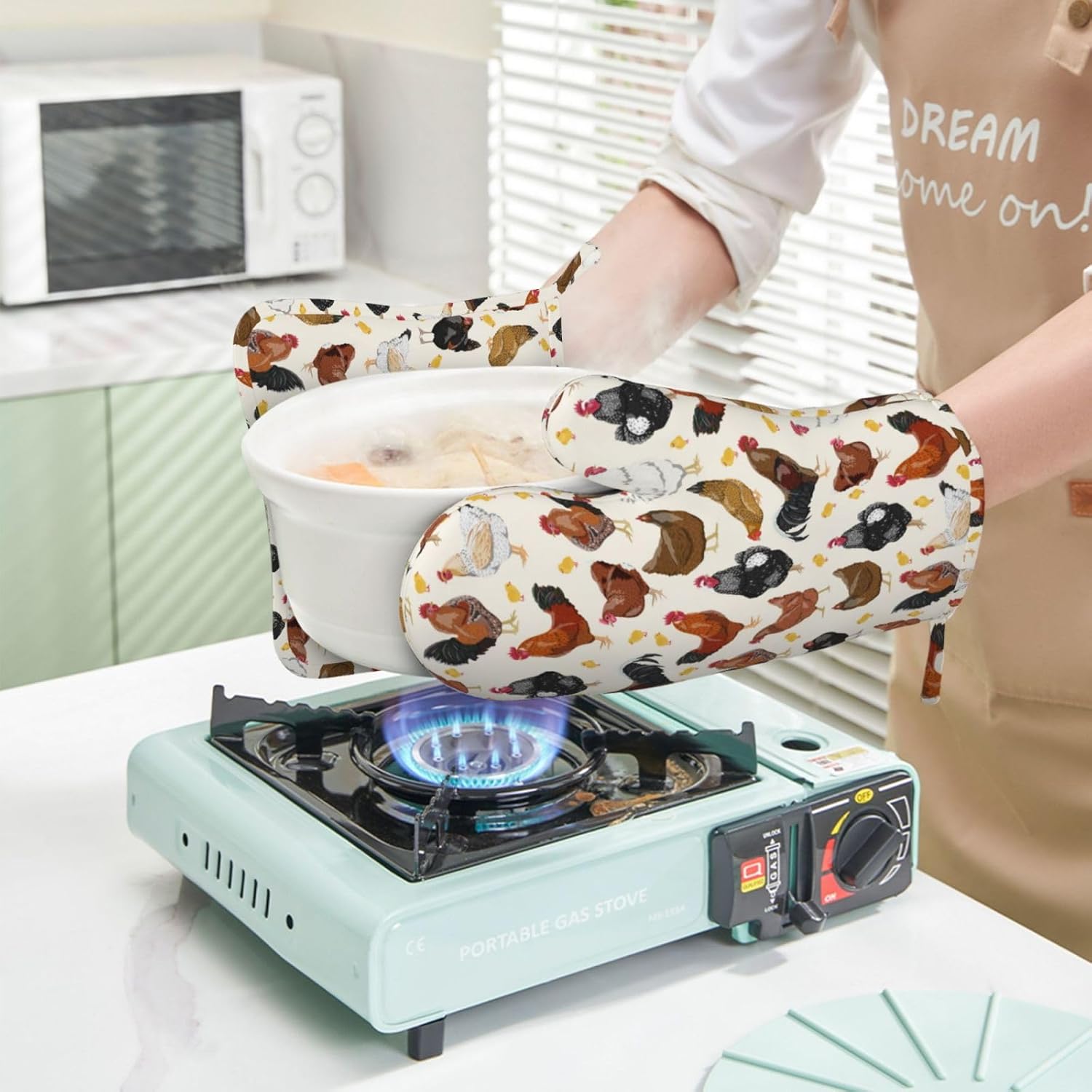 - HEAT RESISTANT: Thicker chicken oven mitts and potholders, heat resistant up to 392 F/ 200 C. Well protect your hands and wrists from burns or steam scalds, and make your cooking time easy and safe. To keep safe-do not use pot holder or oven mitt over an open flame.