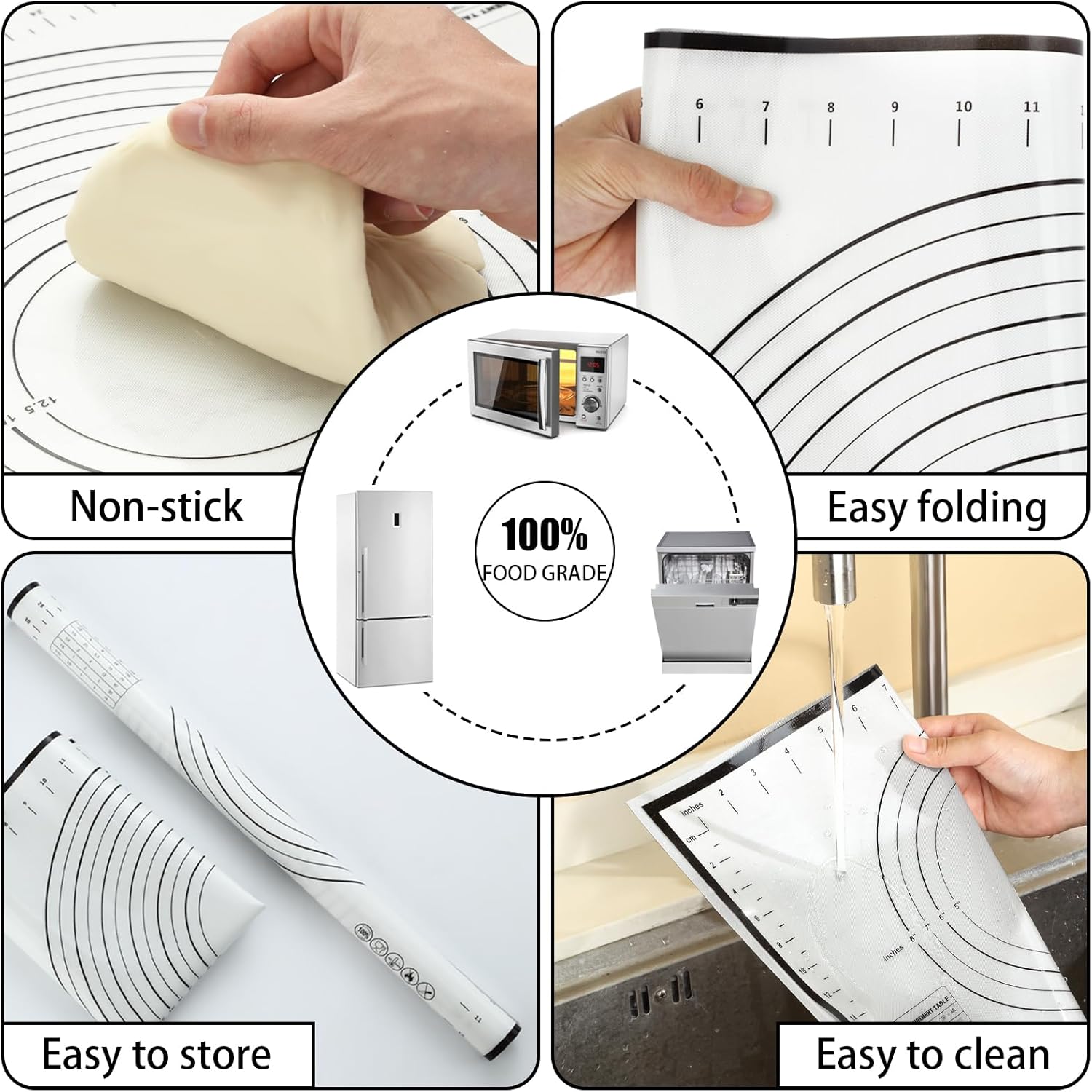 - 【Oversized Non-Slip Baking Mat】This pastry mats for rolling dough has engraved scales on the surface, which allows you to measure the size of the dough easily and accurately. When rolling out the dough, the silicone mat surface with non-stick properties will not stick to the dough,making kneading faster. It is also easy to clean after you use it, just wipe it gently, which greatly reduces the burden of cleaning