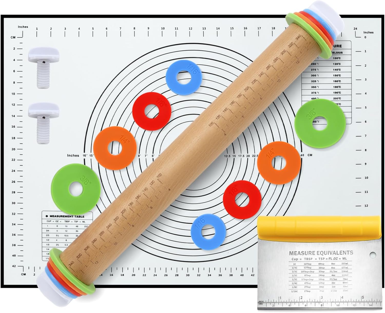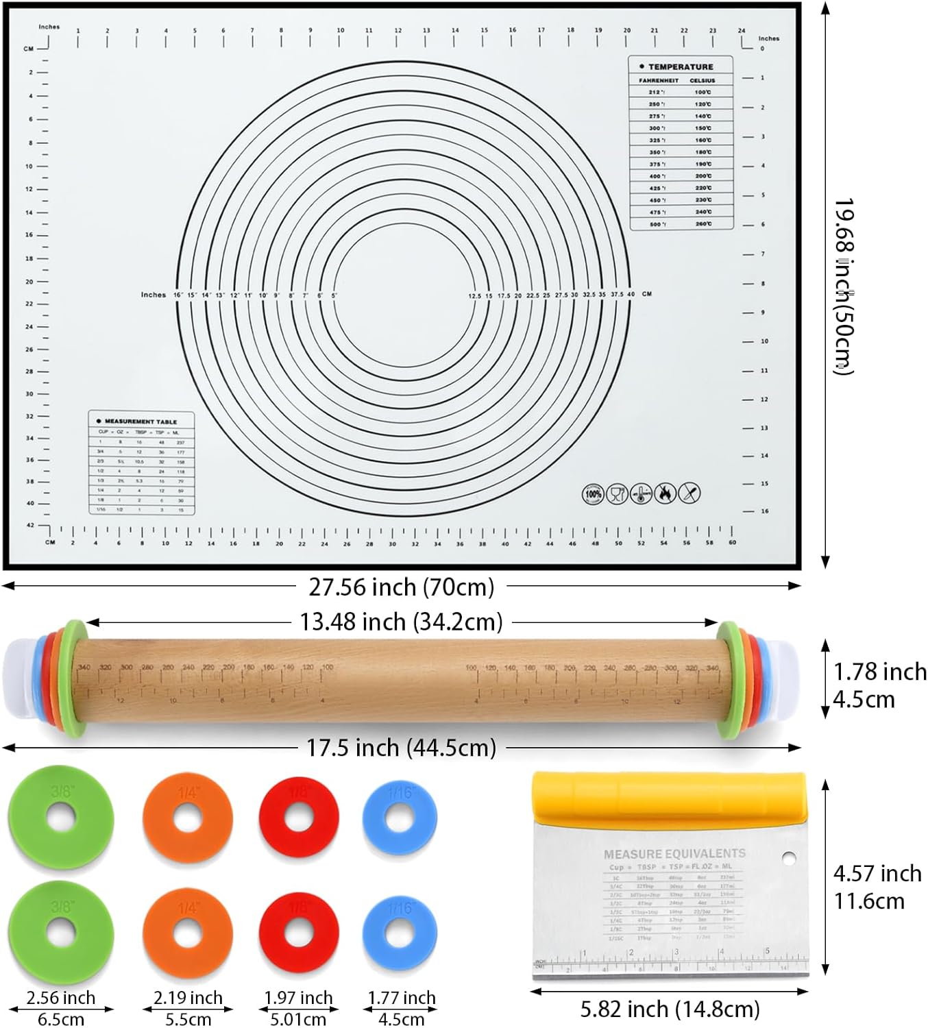 - 【ROLLING PIN WITH THICK RINGS】This 43cm adjustable rolling pin is equipped with 4 adjustable rings of 3/8 inch (10mm), 1/4 inch (6mm), 1/8 inch (3mm) and 1/16 inch (2mm), which can be removed. Whether you want to make pizza, pies, bread, dumplings or pasta, you can precisely control the thickness of different doughs.You can easily roll out the desired thickness and shape, a great helper for baking
