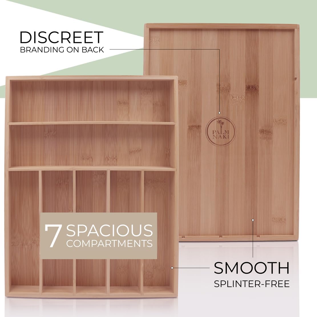 - 🌿 Transform Your Space with Elegance and Efficiency - Discover the ultimate solution to declutter your drawers and beautify your home with Palm Naki's premium bamboo cutlery tray. Designed with precision, our organizer features expansive compartments tailored to fit drawers of any size, ensuring a custom fit that brings harmony and accessibility to your kitchen, office, or vanity.