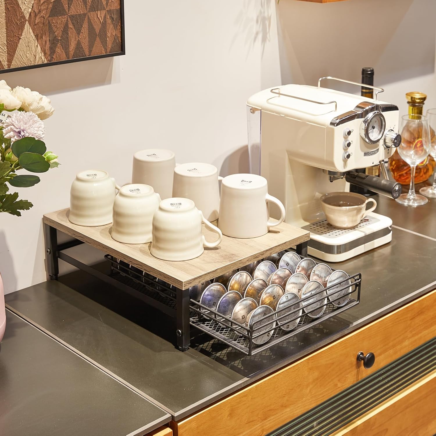 - 【EASY TO USE AND CLEAN】: The sliding drawer is easy to slide in and out, but it won't fall out on the floor.You can take out your coffee and enjoy it anytime. When the coffee station is dirty, just need to wipe.
