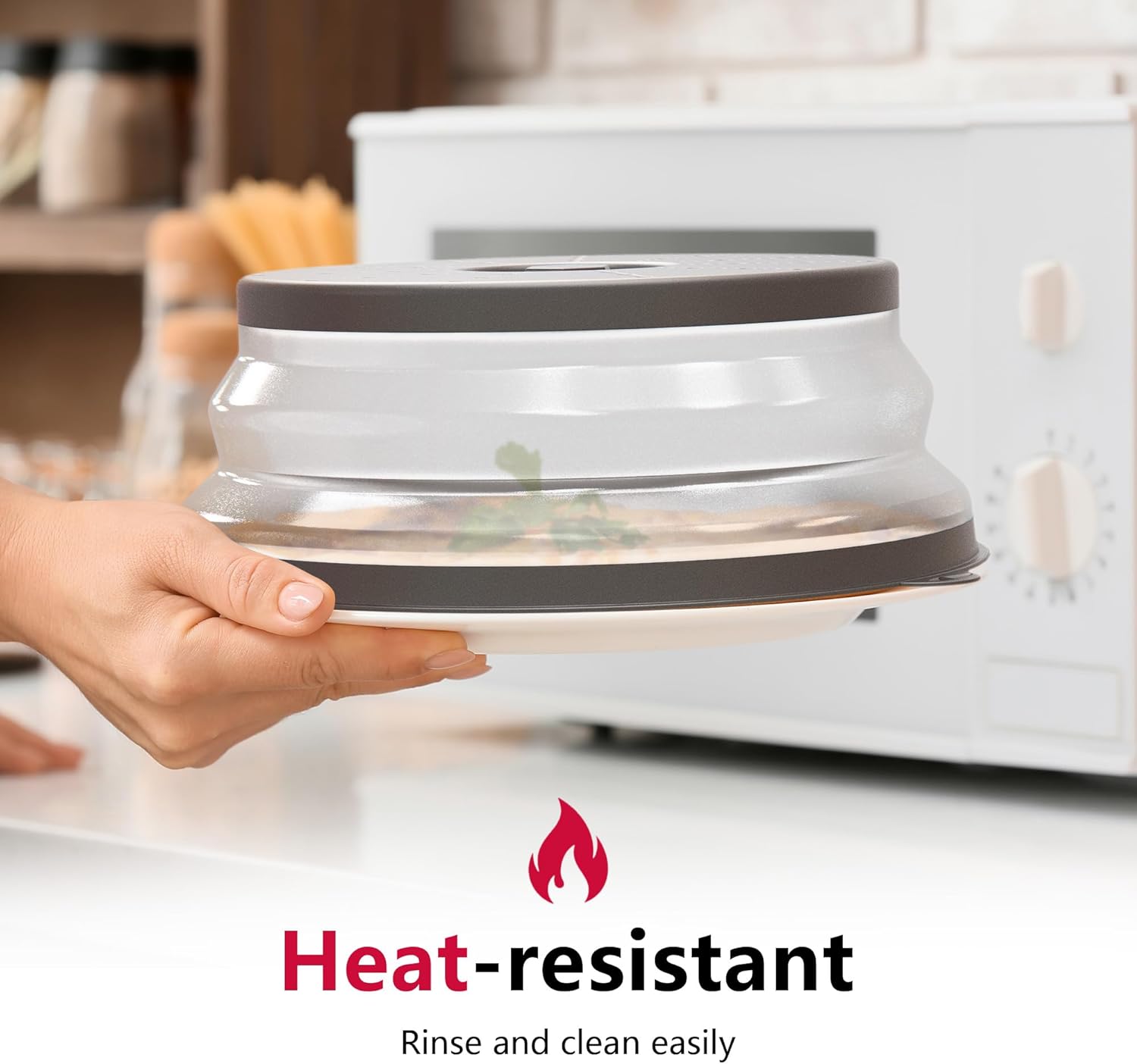 - Microwave Cover: The collapsible microwave cover promotes even cooking and features a vented lid to keep your microwave clean. It measures 10.5 inches by 3.2 inches and fits over most plates and bowls.