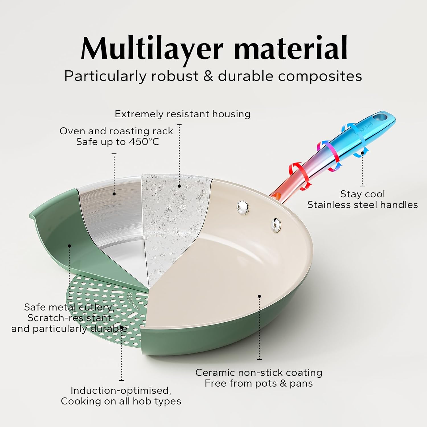 - COOL & STURDY HANDLE: Crafted from lightweight, precision-pressed stainless steel, this ergonomically designed handle ensures a comfortable grip. Double-riveted for exceptional strength and maneuverability, the ceramic skillet pan empowers you to seamlessly transition from stovetop to oven, allowing you to achieve that flawless sear, brown toppings, or even bake