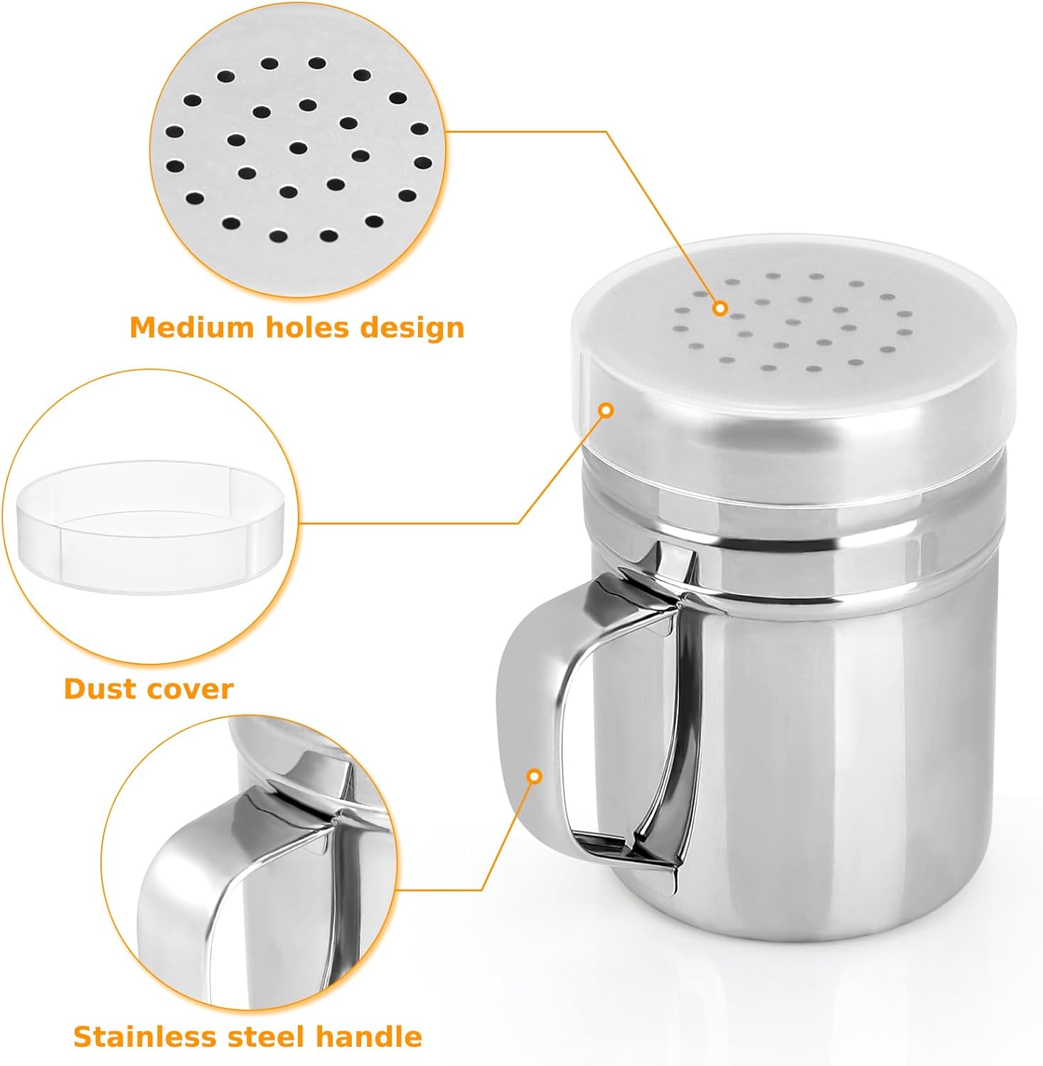 - Twist-off tops, convenient to add powder or other spices. This cooking dredges perfect for used as shaker for salt, pepper, cinnamon, powdered sugar, flour or any other spices, seasonings.