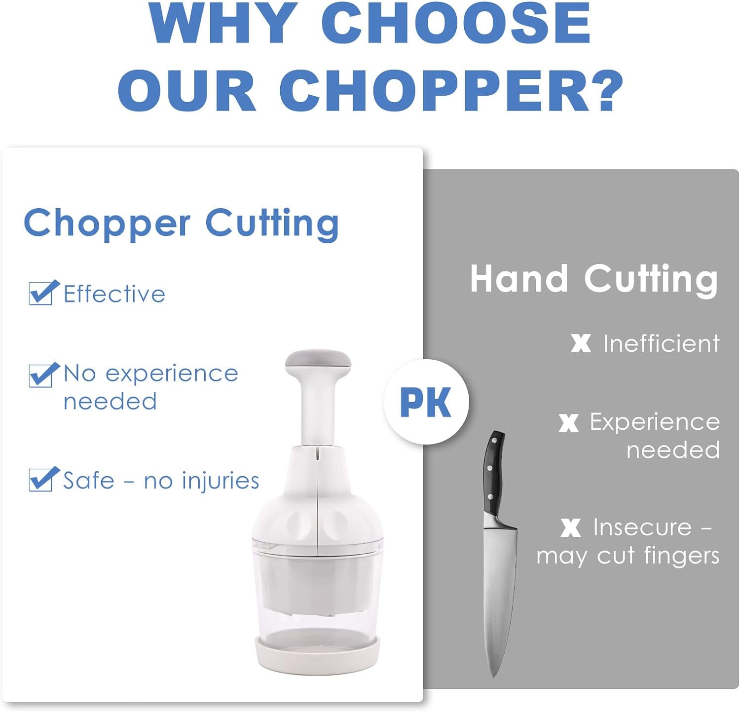 - Safe to operate: Just slap the vegetable chopper to quickly chop garlic and onions in seconds and never get hurt by touching the blades again. The housing arm and blade guard provide extra protection while chopping.