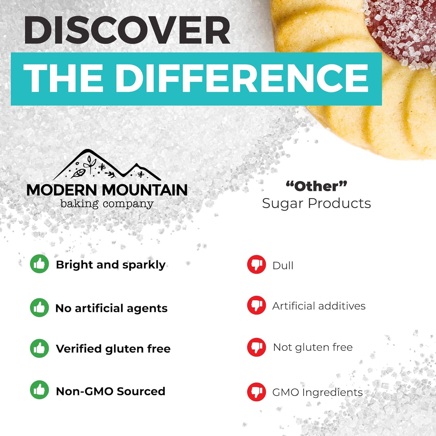 - PARTAKE IN PREMIUM, PROFESSIONAL QUALITY: At Modern Mountain, we believe quality is king and we pride ourselves on carrying the highest quality baking products around. No matter what you’re baking from scratch or just adding a little razzle dazzle to, you can rely on us to pack your pantry with products that we source non-GMO, test and verify gluten free claims, and never pad with artificial colorants or additives. The same is true of our white sanding sugar, of course, which are the brightest, most brilliant sparkle sugar crystals available.