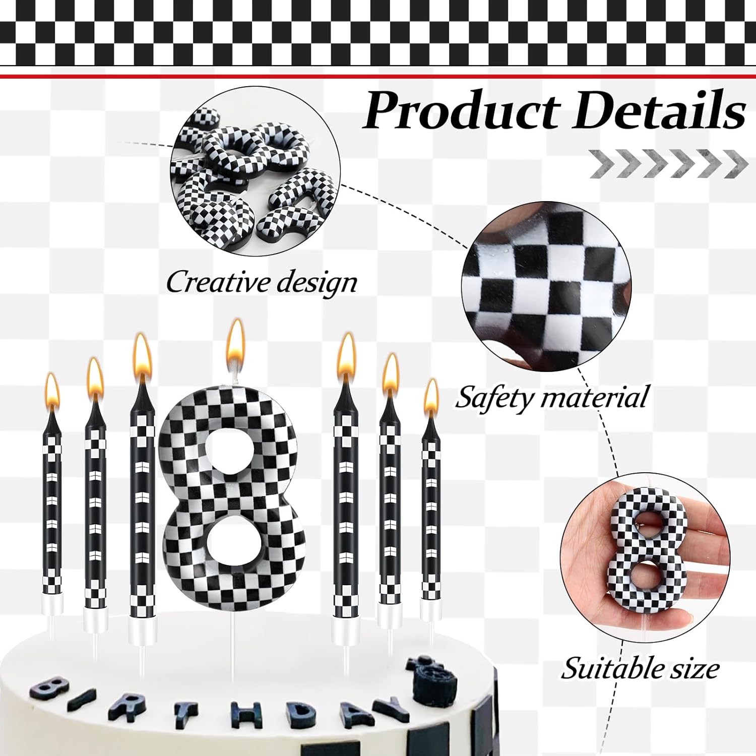 - The Package Includes: You will receive 12 black and white track car themed birthday candles and 1 number 8 black and white checkered candle, Sufficient quantity for birthday cake decoration or party celebration and daily use, note: the candle will slowly melt as it burns, and it is recommended not to leave it on the cake for more than two minutes
