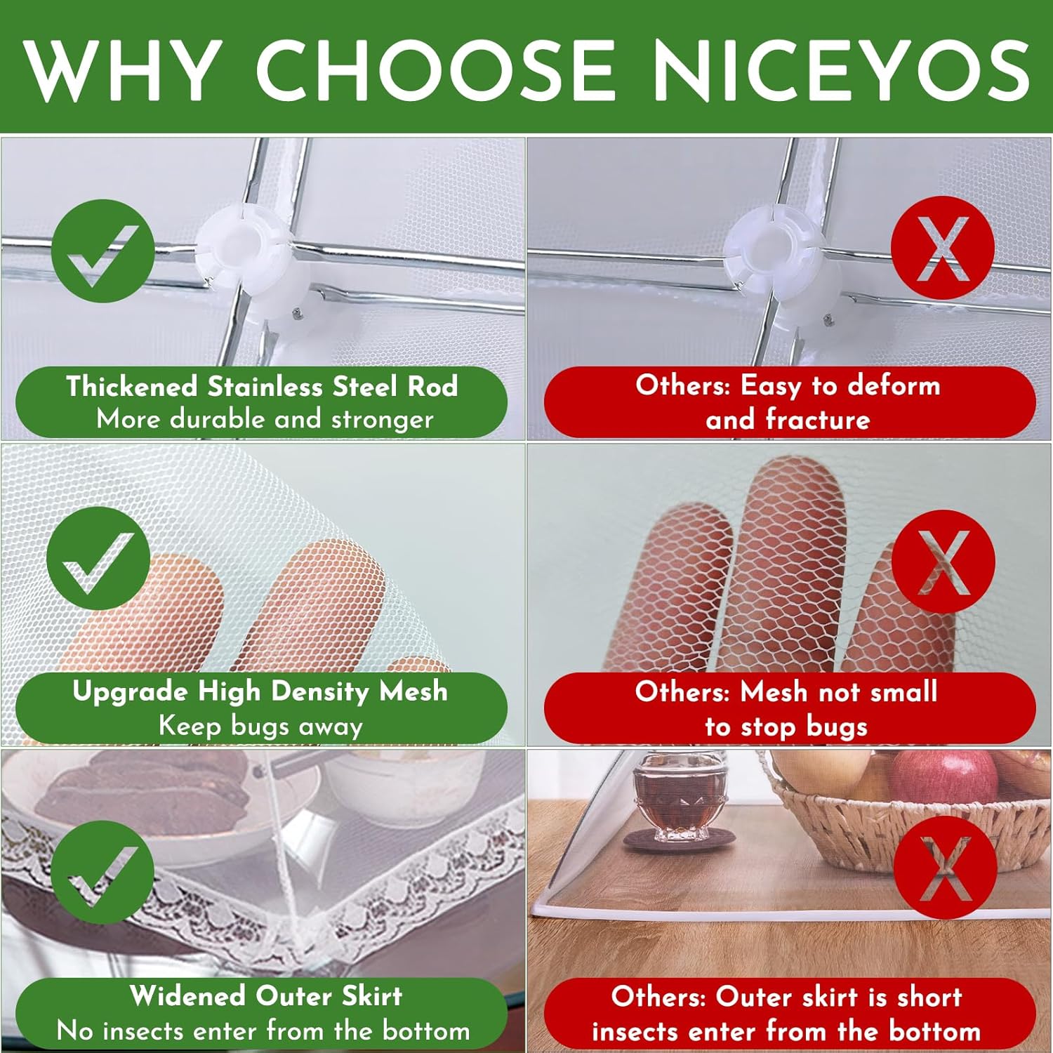 - BUILT TO LAST - Niceyos is committed to producing high quality and excellent kitchen home products. Our food cover frame is made of thickened USA standard stainless steel, which is durable and not easily deformed, not easy to be blown away. High density nylon mesh has strong tear resistance. Cheers to hitting those milestones!