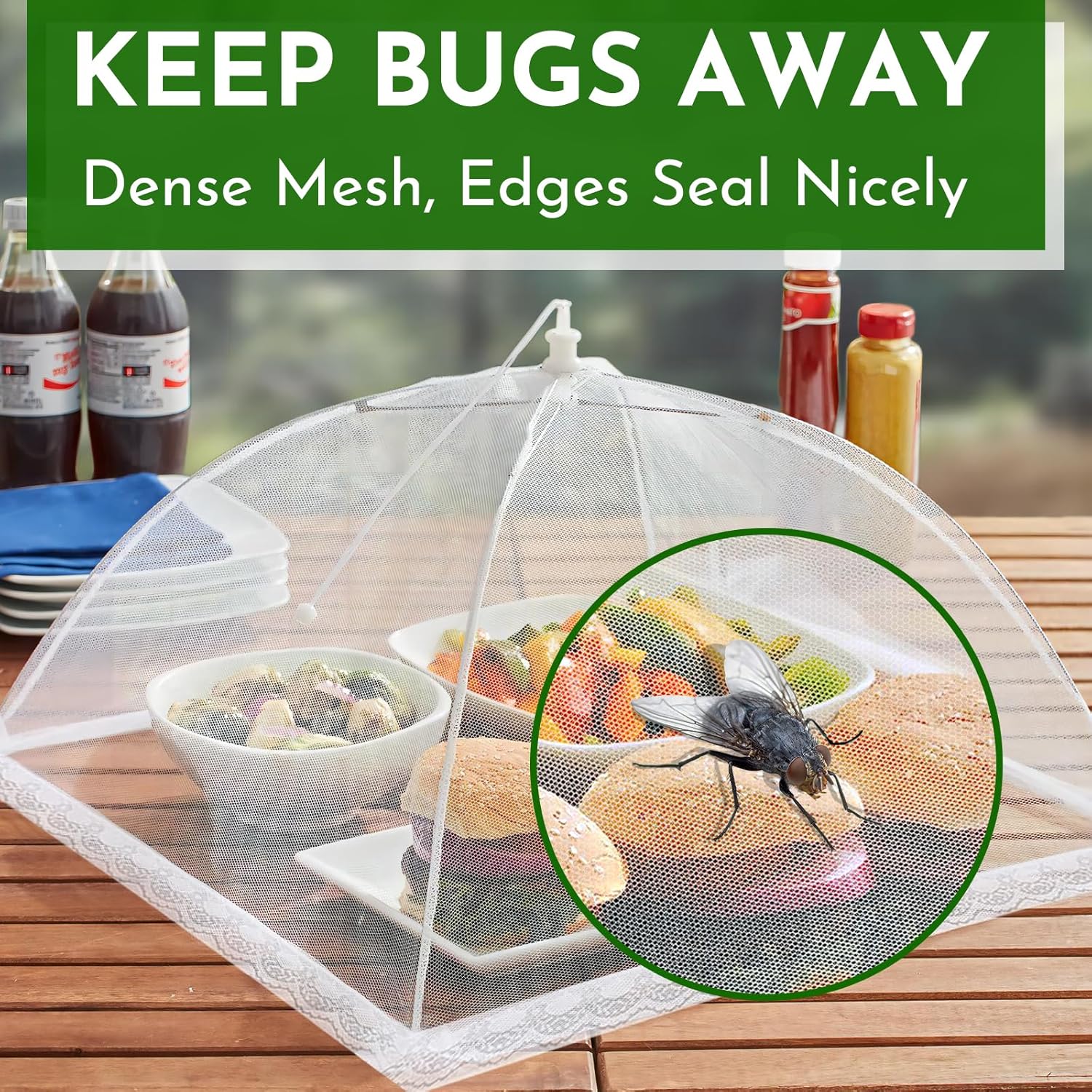 - MORE EFFECTIVE IN KEEPING FLIES AWAY - Our improved food covers feature an UPGRADED 1mm high density mesh, better than regular 2mm mesh from other brands. It is more effective in keeping flies away. The mesh is dense enough to keep out dust and protect your food. The edges of the food covers are lengthened to fit snugly on the table.