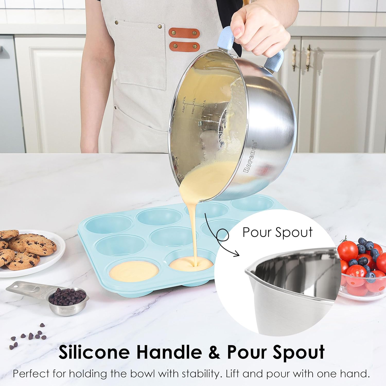 - EASY TO USE: The silicone handles make the bowls easier to lift and hold down on a surface. The pour spout allows for easier pouring. The non-slip silicone bottom ensures the bowls will stay in place when you mixing
