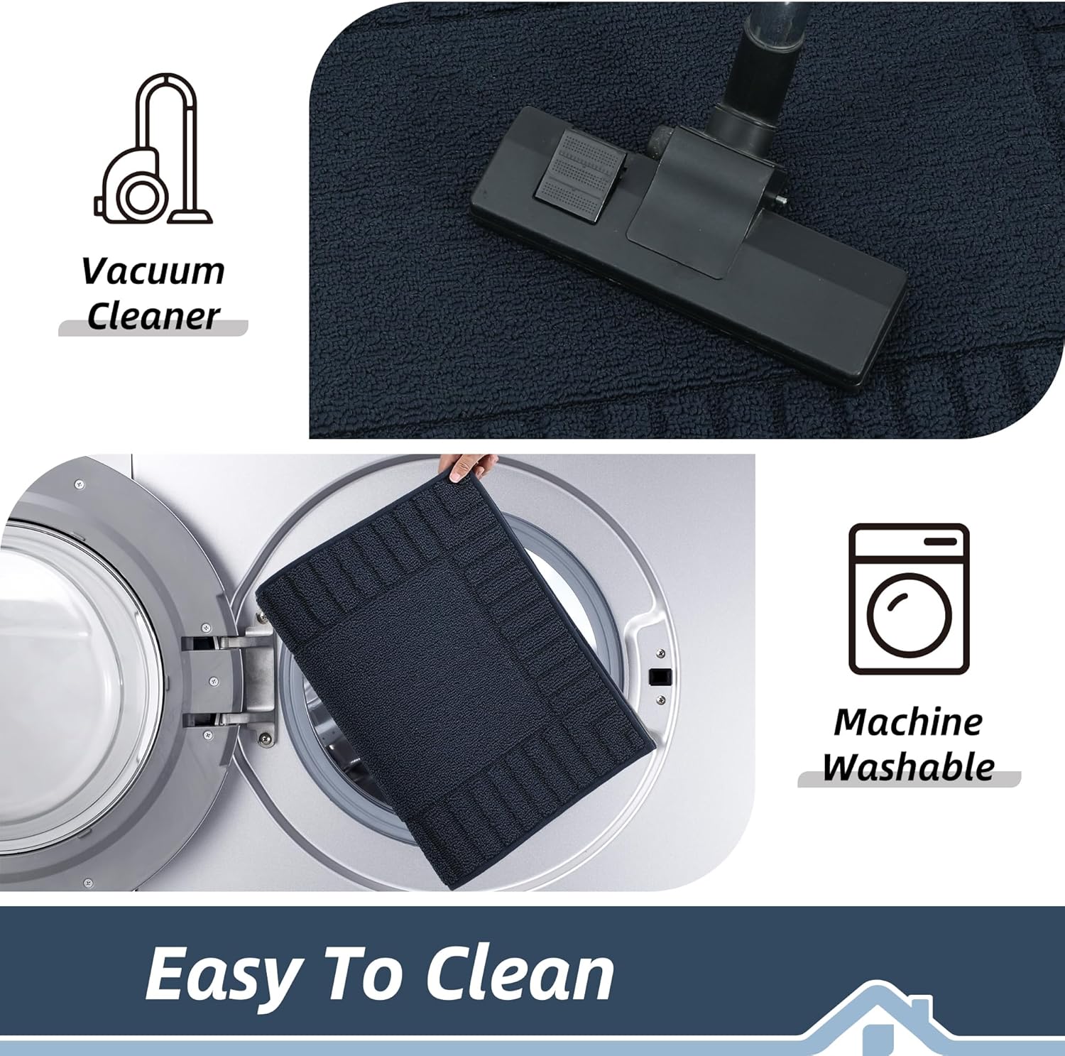 - Our kitchen rugs and mats non skid washable are easily cleaned.You can use the vacuum.Also,they are machine washable.Don't worry about fiber falling because of edge locking technology.Our kitchen floor mats can be tough and reusable for long time.Kitchen mat still maintains shape and colors