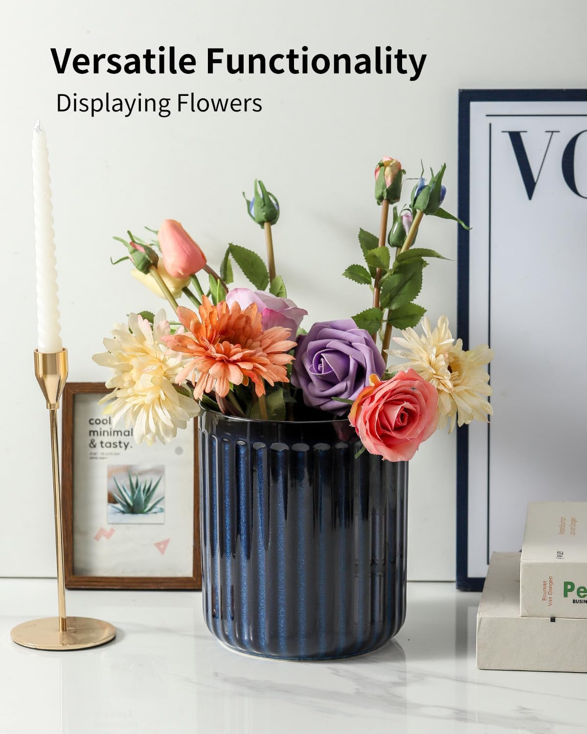 Hasense Ceramic Utensil Holder, 7.3" x 6.2" Ribbed Utensil Crock for Farmhouse Decor, Porcelain Cooking Utensil Holder for Kitchen Countertop, Utensil Organizer for Housewarming Gift, Navy Blue