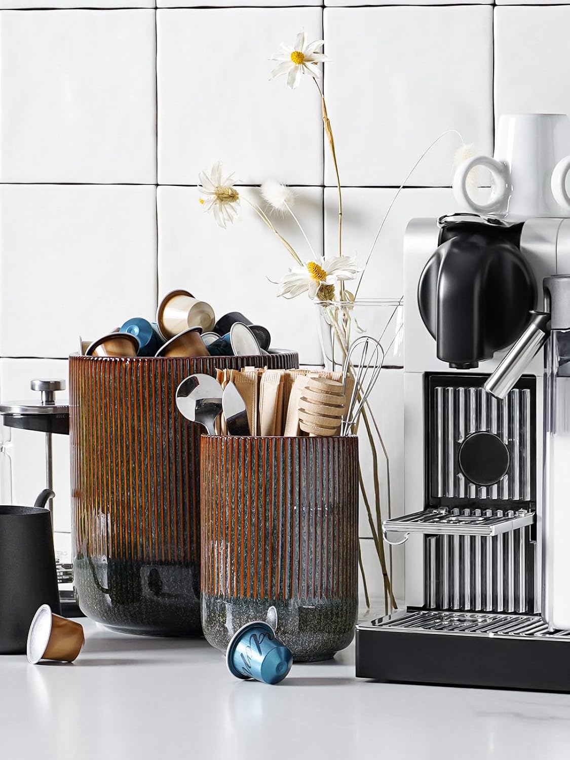 - Chic Modern Home Decor: Our kitchen utensil organizer features a crisp, modern finish highlighted by vertical ribbed and fluted stripes; This stylish design seamlessly complements any kitchen decor, improving both your culinary efficiency and the overall ambiance of your home