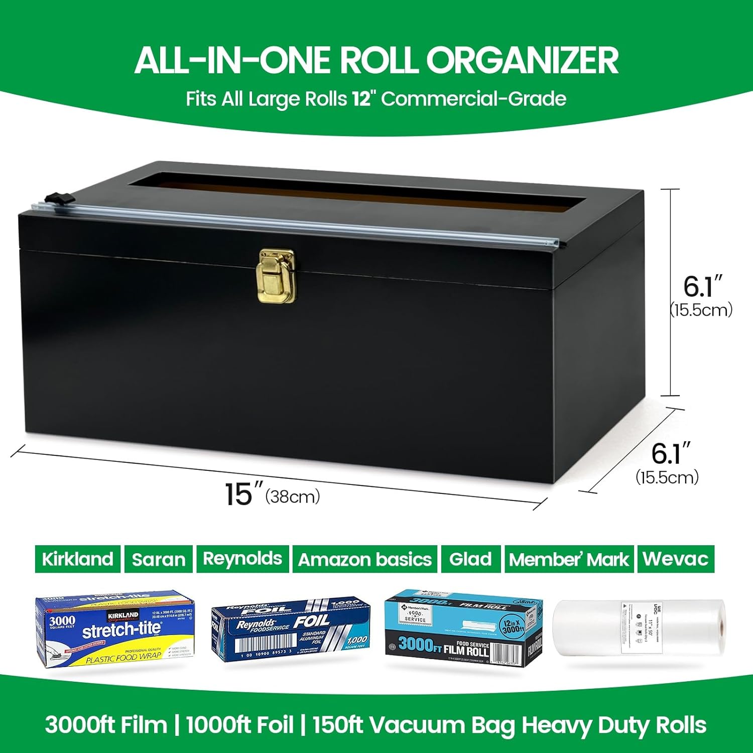 - Fits All Standard 12" Large Rolls – Compatible with 3000ft plastic wrap (e.g., Costco Kirkland/Sam’s Club) and 500-1000ft foil rolls (Reynolds, Glad), solving the frustrating search for a universal dispenser. Engineered to securely hold oversized rolls without slipping or jamming.