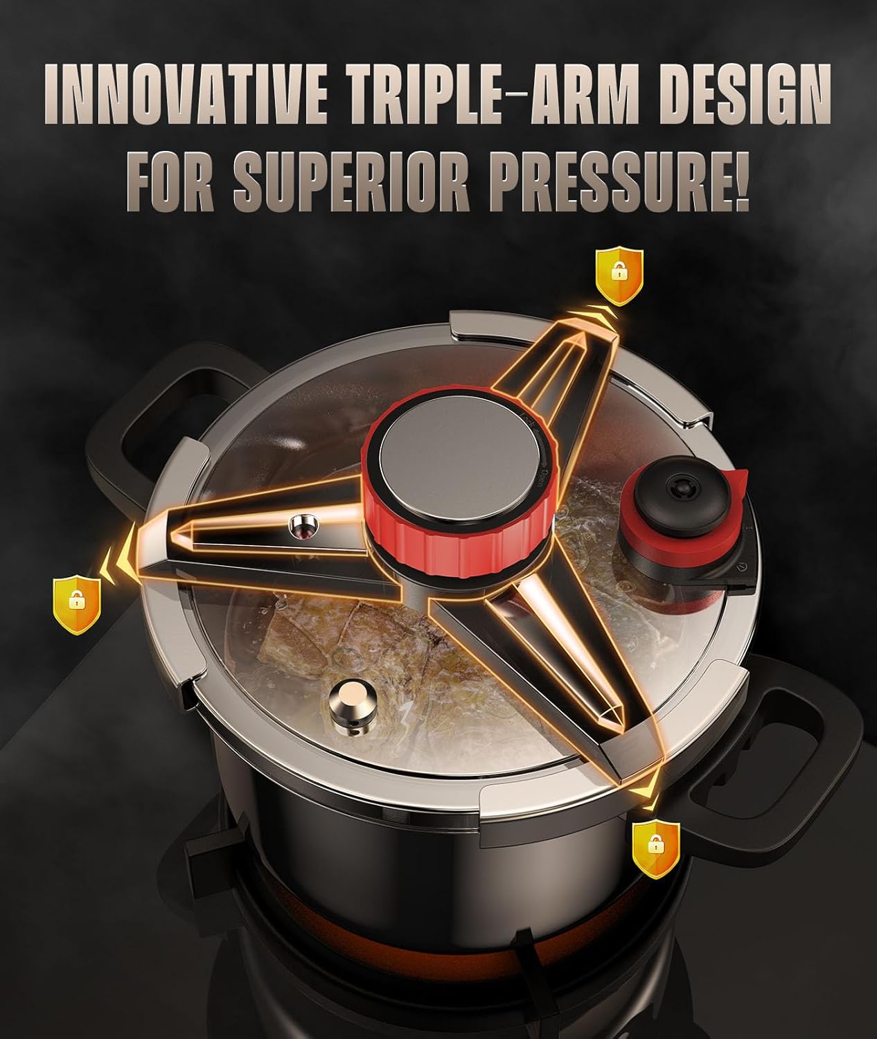 - Save Time with Revolutionary Efficiency - Our stainless steel pressure cooker cuts cooking time by 70% compared to traditional pots and 35% faster than other pressure cookers, thanks to its innovative design. The tri-arm structure ensures a triangular stability, with wider clamp coverage that enhances the sealing capability. Tested to support up to 15PSI of pressure, it accelerates cooking like never before! Experience the ultimate cooking convenience, delivering quick and delicious meals for every family!