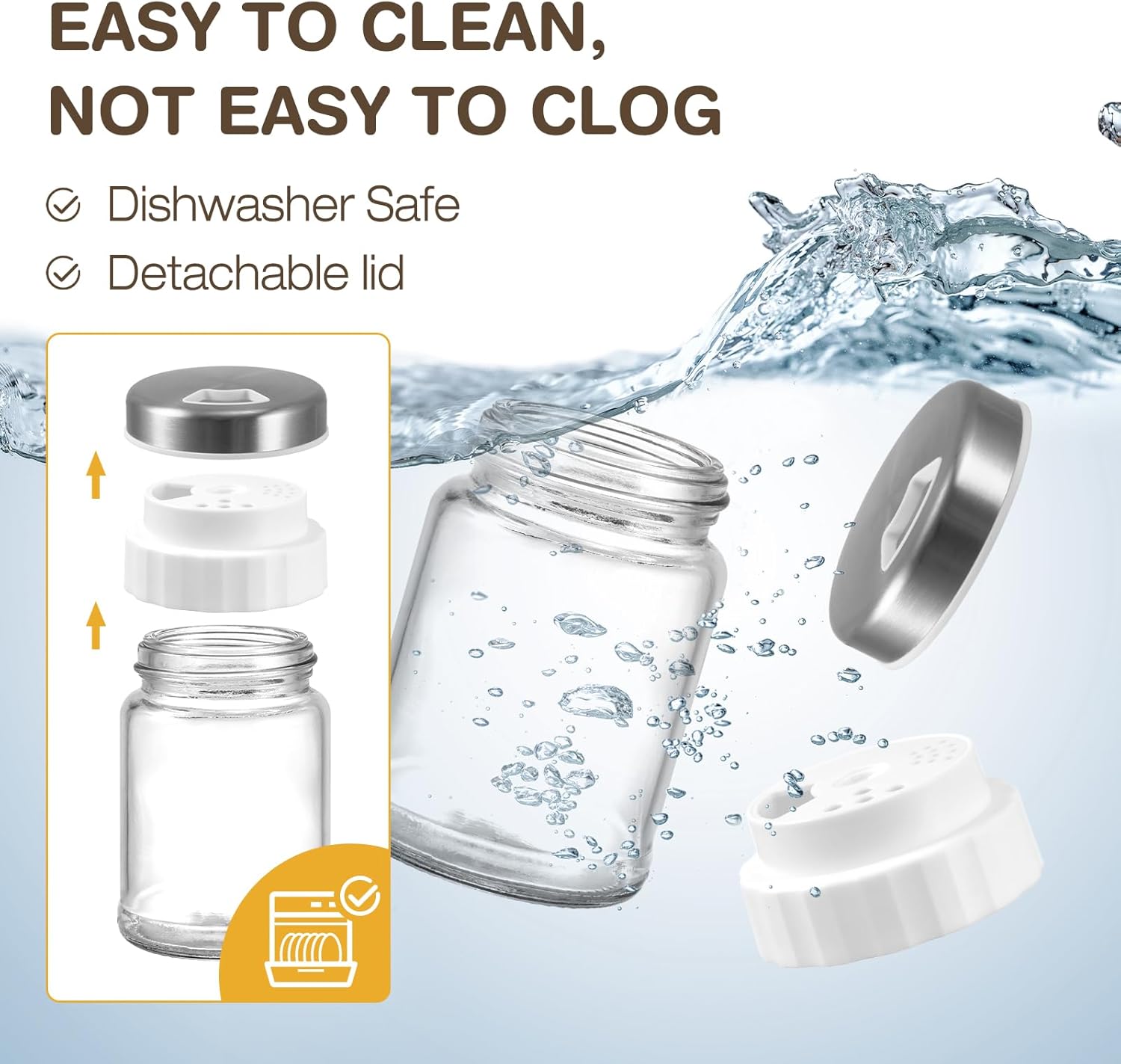 - Easy to Clean - The detachable lid and glass bottle are dishwasher safe and can also be hand washed. The spice shakers are suitable for various spices; fill them with your favorites such as black pepper, Himalayan salt, sugar and other spices.