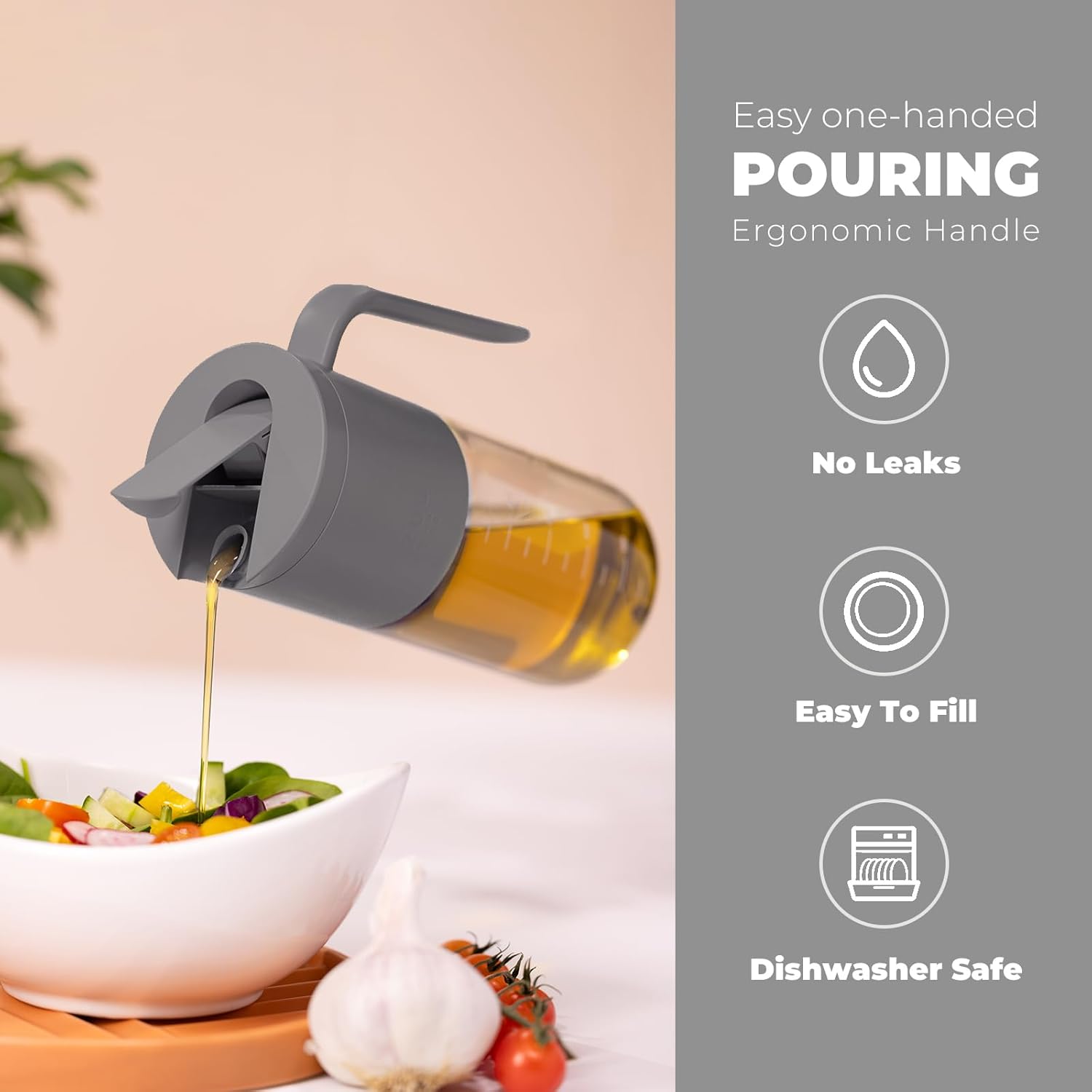 - Auto Flip Lid – One-Hand Use & No Drips:Equipped with a smart auto flip cap, this dispenser opens and closes automatically with a simple tilt—perfect for one-handed use. The leak-proof spout ensures no drips or mess, keeping your countertop clean. It also helps keep oil fresh by sealing out air and dust when not in use.