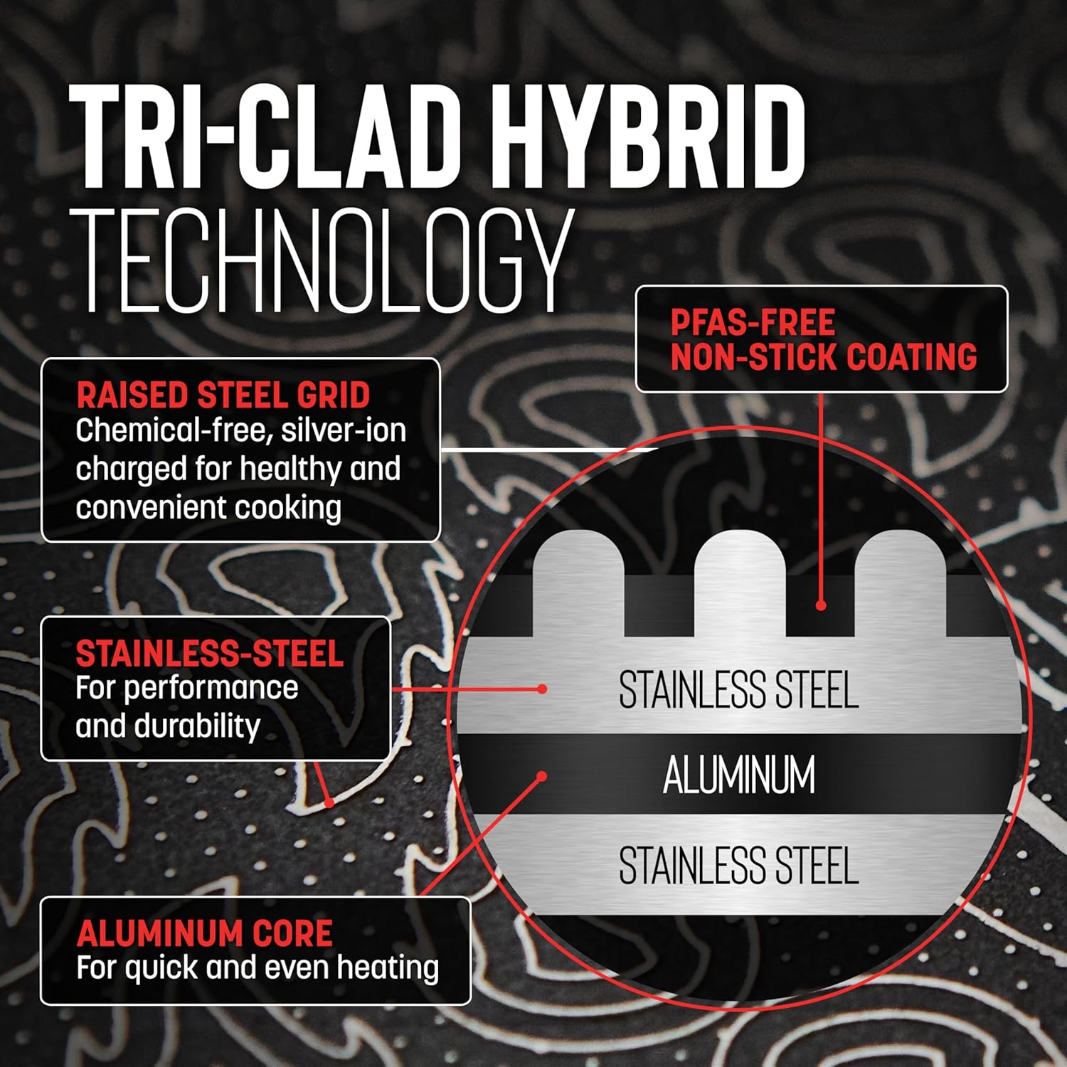 - TRI-CLAD STAINLESS for Quick & Even Heating: Hell’s Kitchen Hybrid Tri-Clad cookware features stainless steel construction with a conductive aluminum core, and a laser-etched flame pattern above a durable nonstick surface.