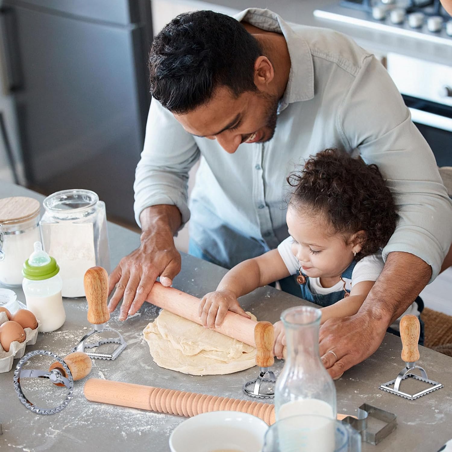 - Suitable Size: Pasta making kit is the suitable size for home use. Dough roller: 11.4×0.98 inch/29×2.5 cm. Ravioli rolling pin: 13.58×1.18 inch/34.5×3 cm. Gnocchi board: 8.4×3.3 inch/21.5×8.5 cm. Pasta cutter wheel: 6.2×1.5 inch /16×4 cm. The ravioli stamp cutters sizes are: large square 4.1×2.7 inch/10.5×7 cm, small square 3.9×1.9 inch/10×5 cm, large round 4.1×2.5 inch/10.5×6.5 cm, small round 3.9×1.9 inch/10×5 cm, triangle 3.9×2.7 inch/10×7 cm, heart 3.9×2.3 inch/10×6 cm, star 3.9×2.1 inch/10×5.5 cm